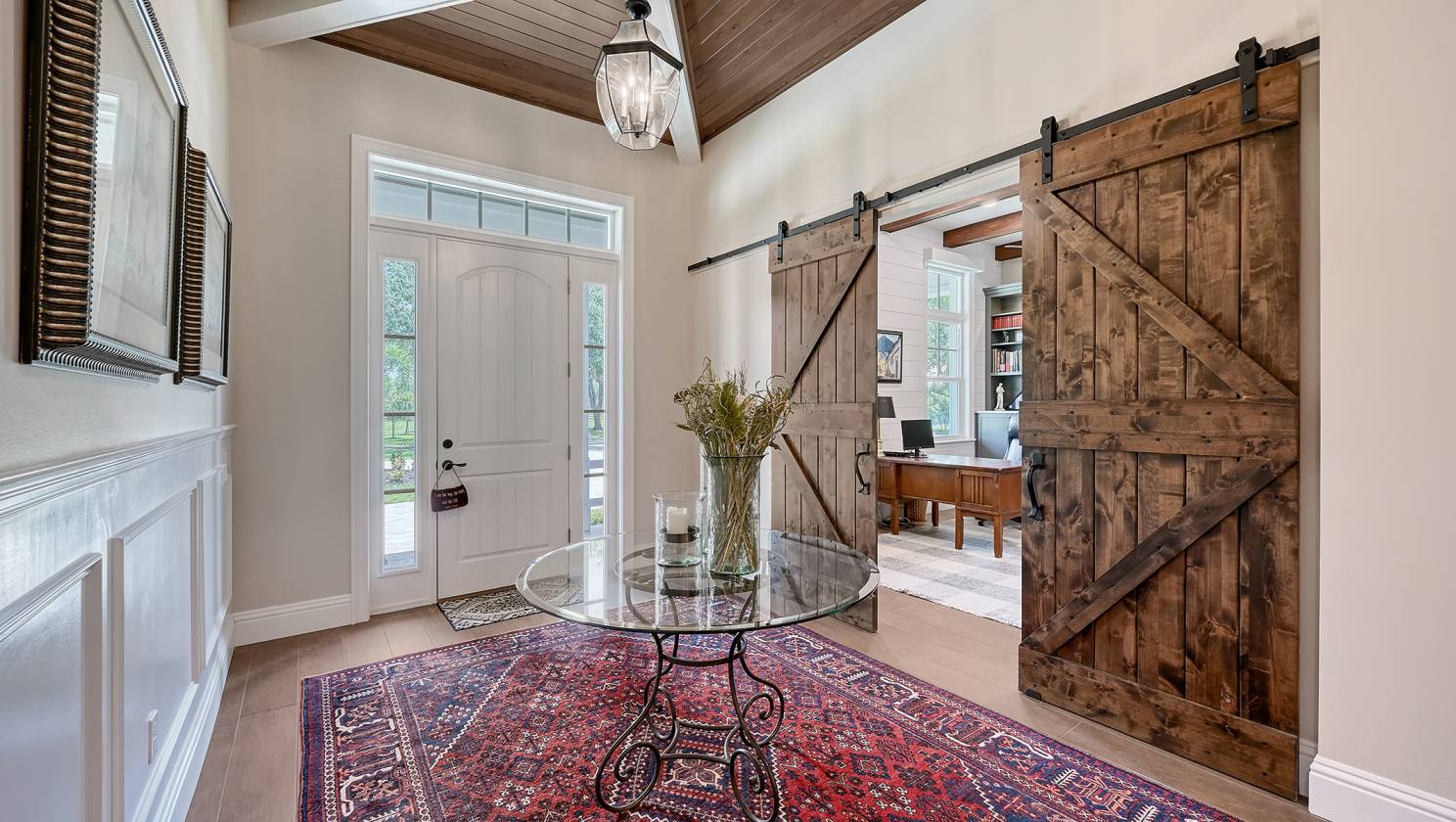 - Barn Doors- Glass Craft Knotty Alder with black hardware (Slade BDAOIK, Monterey HP2, Vista HP4). Her Master walk-in closet features a stained Double Z 2-panel door, while the Study, Media Room, and Bedroom #4 walk-in closets have painted versions. His Master walk-in closet showcases a prefinished Winter White Z door with an offset headrail.– Interior Glass Transoms: Elegant transoms with wood returns and external muntins over specified doors (W38-W46) add architectural sophistication.