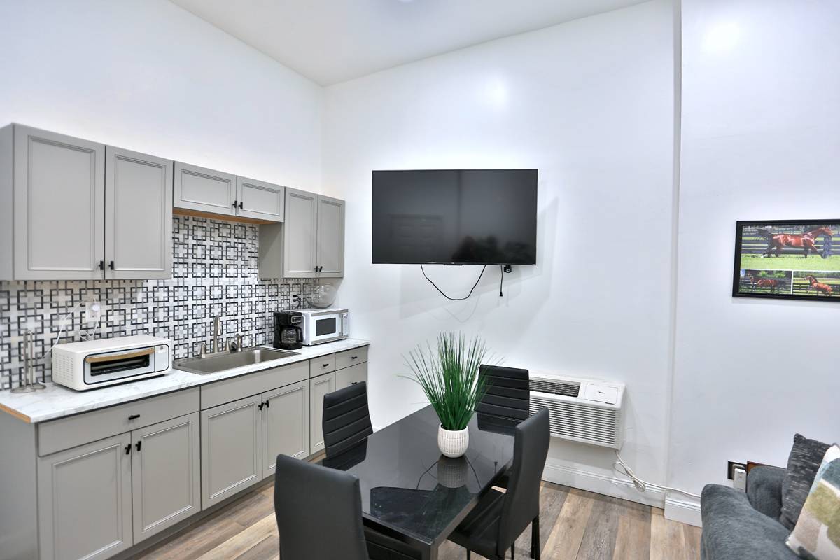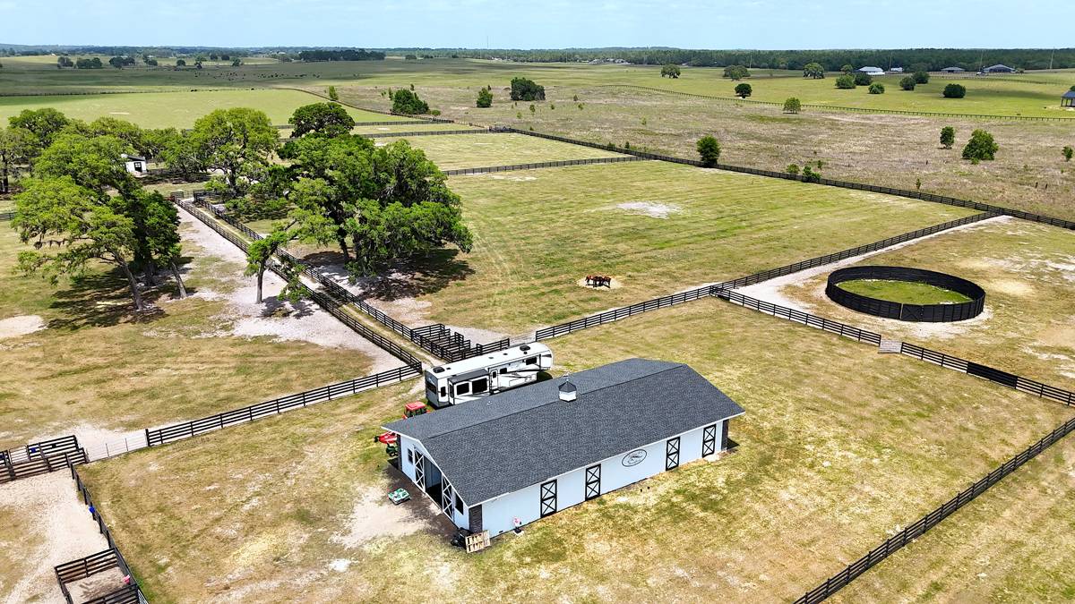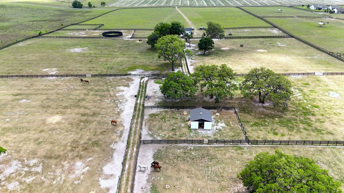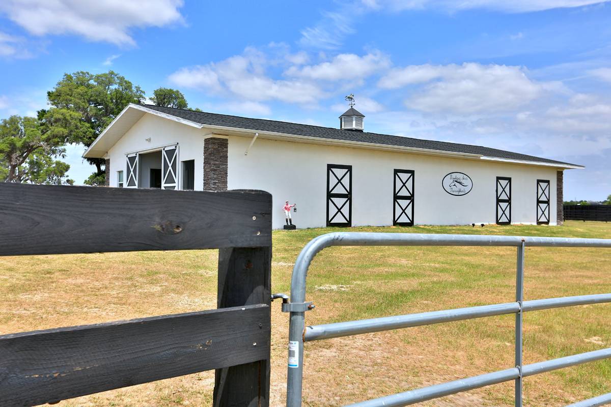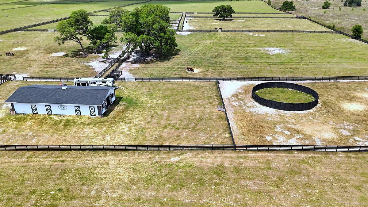 - The center aisle main concrete block barn features 7 matted stalls with fans, lights, and a back door to each stall. The efficiency apartment features a full bath, laundry room, and a break area. The barn also features a wash area, center feed room, storage room, and mechanical room. Round pen and 50-amp RV hook-up add to the property. The property is perimeter fenced and ready for horses or cattle with 12 paddocks. The back barn features two foaling stalls and hay storage. Separate garage with 4 bays, of which 2 are enclosed.