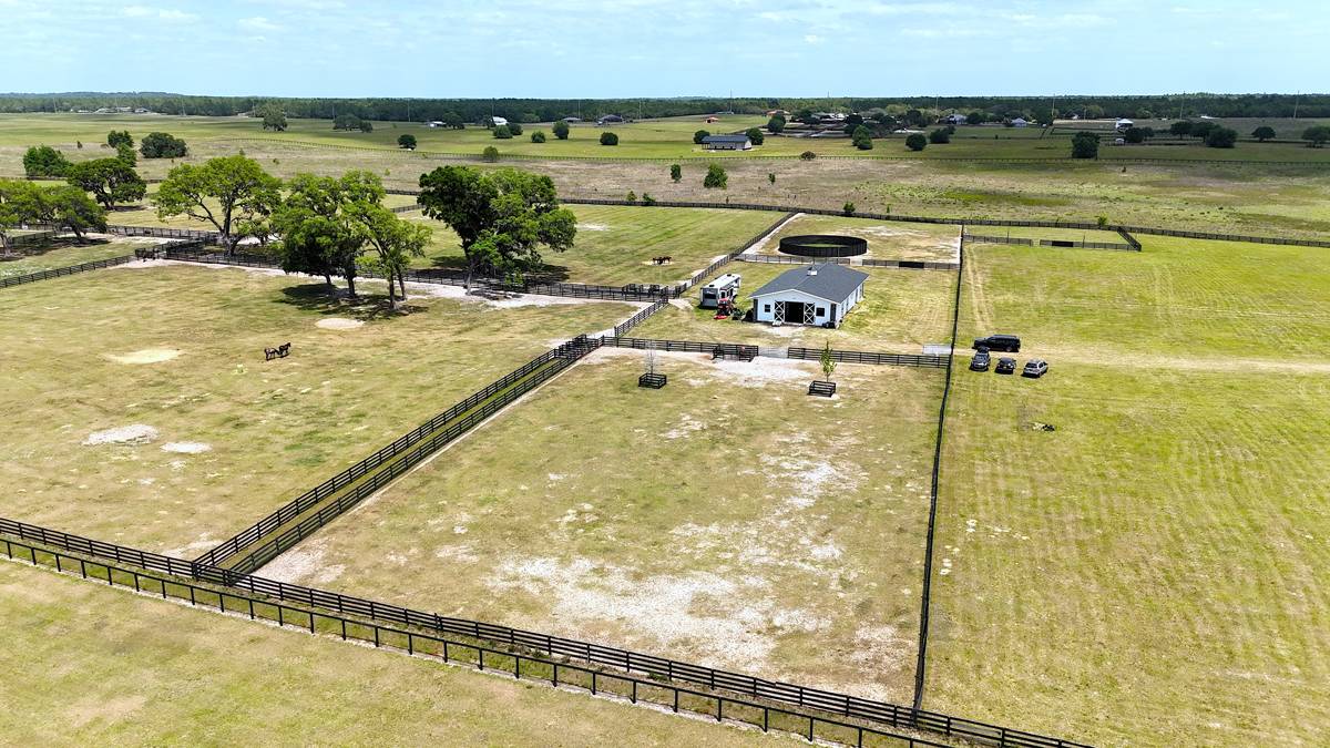 Premier 50± Acre Equestrian Farm | 7-Stall Barn | Optional 3,600 SF Emerald Model by Triple Crown Homes. This exceptional 50± acre equestrian property is beautifully situated on a high and scenic elevation and is fully equipped for horses or cattle, offering an outstanding opportunity near the World Equestrian Center. The property features a center-aisle concrete block barn with 7 matted stalls, each equipped with fans, lighting, and individual rear access doors. An efficiency apartment within the barn includes a full bath, laundry area, and break space—ideal for staff or on-site management. Additional barn amenities include a wash area, center feed room, storage room, and mechanical room, all thoughtfully designed for functionality and ease of operation. A secondary barn provides two foaling stalls and hay storage, while the farm is fully perimeter fenced and divided into 12 paddocks, ready for immediate use. A round pen and 50-amp RV hookup further enhance the property’s versatility. A 3,600 SF Emerald model residence by Triple Crown Homes is available to be built, offering a 3-bedroom, 2-bath layout consistent with the Emerald model currently showcased by the builder. Details regarding construction and finishes are available upon request. The current price reflects the value of the land, the exquisite residence, and the exceptional equestrian facilities, presenting a unique opportunity to embrace a lifestyle of elegance and charm. Conveniently located approximately 9± miles from the World Equestrian Center