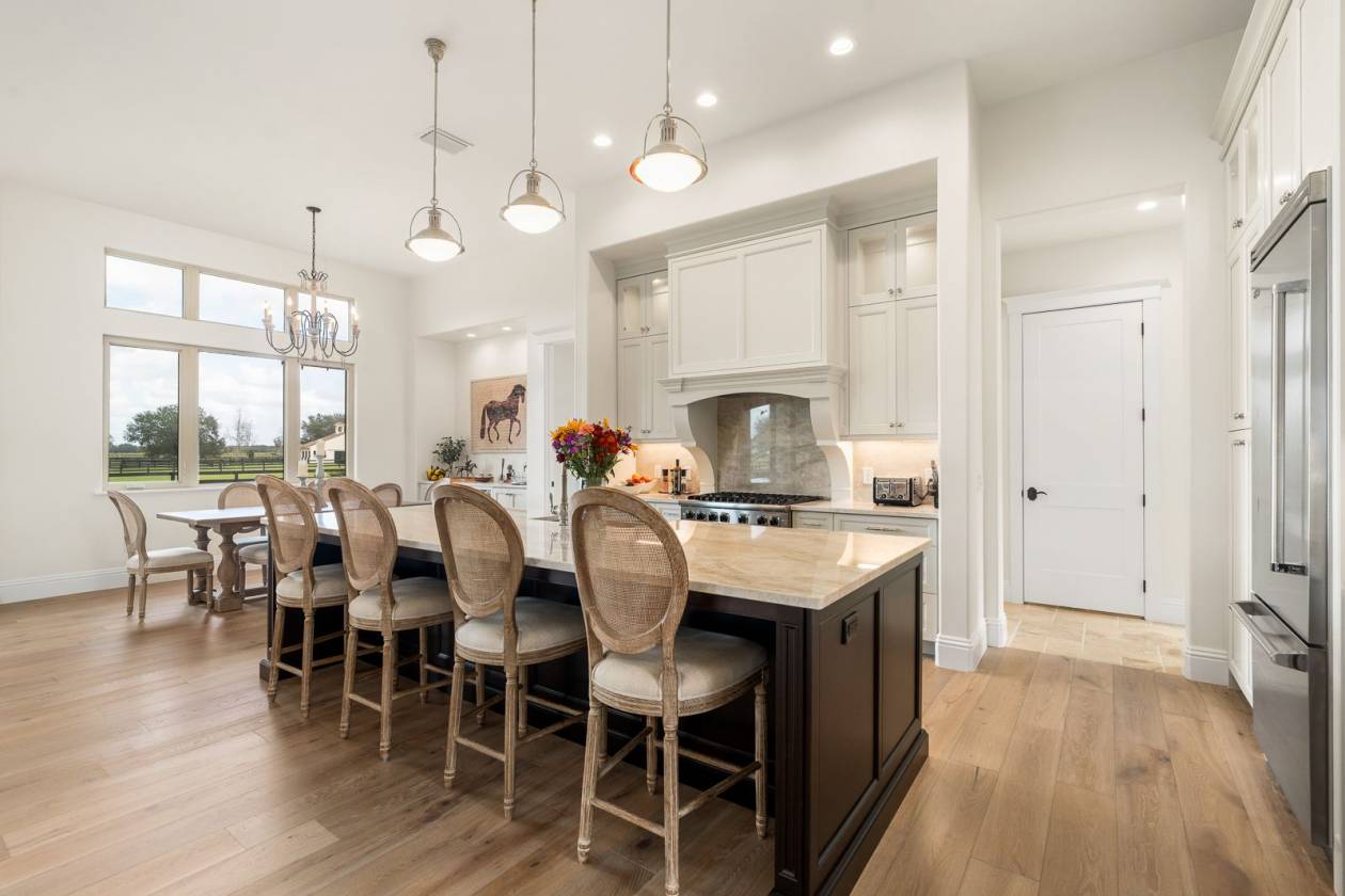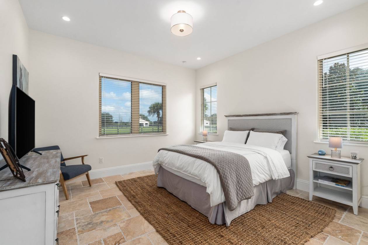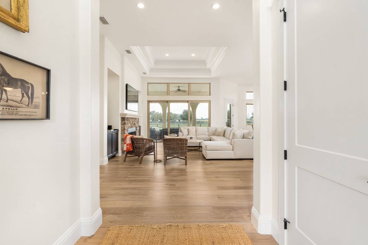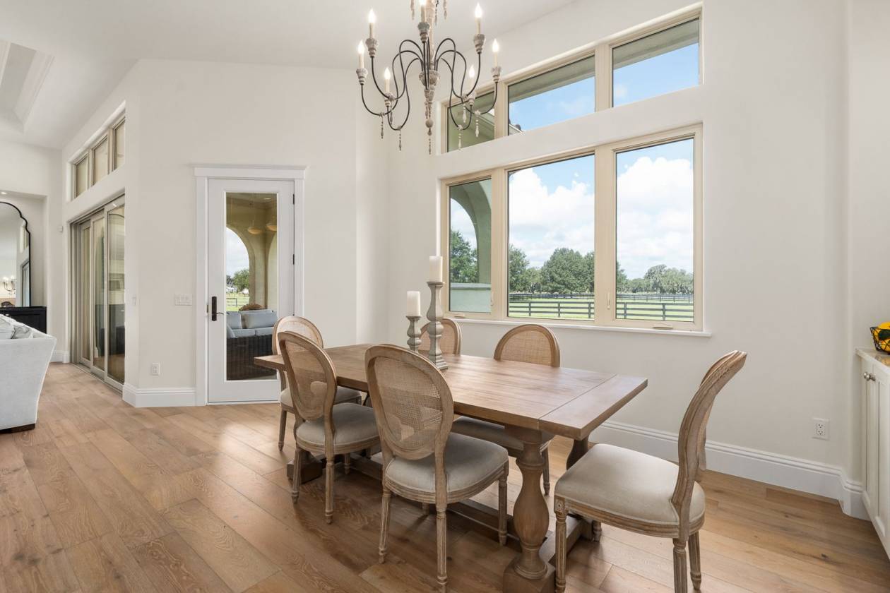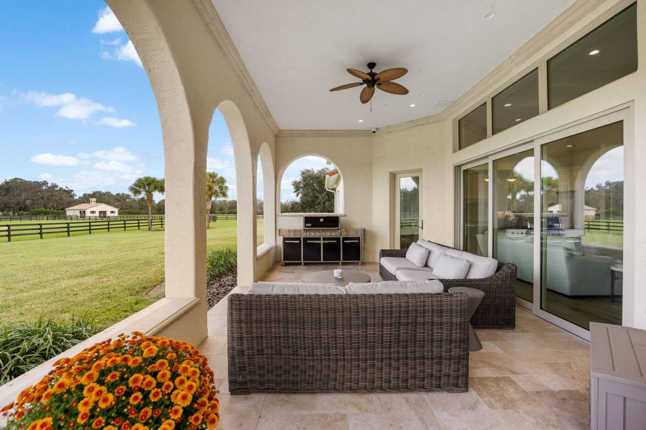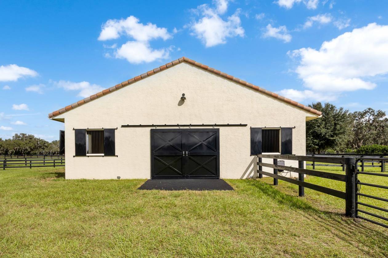 Set within the gated lakefront and equestrian enclave of Bel-Lago, this 6.32-acre equine estate embodies contemporary luxury at its finest. Completed in 2020, the custom-built residence showcases exceptional craftsmanship and materials throughout, and offered turn-key with the latest furnishings from Arhaus and Restoration Hardware. Soaring ceilings with tray detailing, travertine and hardwood flooring, and custom Dixie Workshop cabinetry throughout set a tone of refined sophistication. In the kitchen, natural light dances across the Taj Mahal quartzite countertops, and stainless-steel Viking appliances provide stylish performance. This property features 3 bedrooms + den, and 3.5 bathrooms. Each spacious bedroom is complemented with spa-inspired ensuite bathrooms, with your third guest suite offering an additional exterior private entryway, perfect for guests, multi-generational living, or farm staff. Beyond the walls, sweeping views of grand oaks and open paddocks unfold from the lanai, leading your eye to the heart of the property - a striking European style 3-stall block barn with Dutch stall doors, Equitan + SoftStall flooring, Pyranha fly spray system, spacious feed/tack rooms, stall cameras, and all the details that define a true equestrian haven. A newly laid 120’x200’ arena and lush fenced pastures make training and turnout effortless. Additional features include a whole-property (including barn) generator, and a comprehensive security system covering both the home and barn stalls for added peace of mind. From your backyard, enjoy direct access to Bel-Lago’s multi-use trail system - over 7 miles upon community completion - surrounded by 8,000+ acres of protected preservation. It’s a setting that offers peace and privacy, yet remains just minutes from Ocala’s major show venues, including the World Equestrian Center, HITS, and the Florida Horse Park. Sleek, serene, and meticulously maintained, this residence stands among Bel-Lago’s most refined - where modern design meets the timeless beauty of horse country.