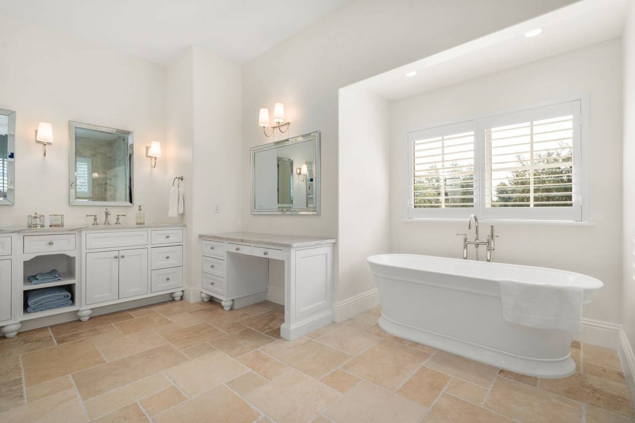 - Travertine + Hardwood flooring