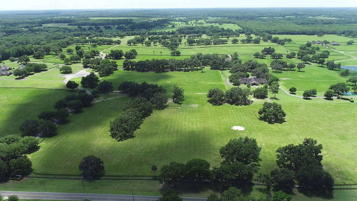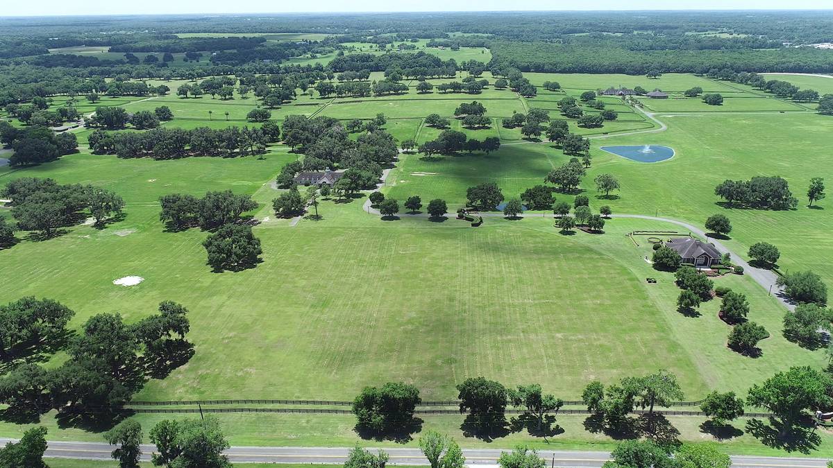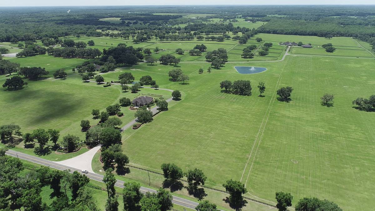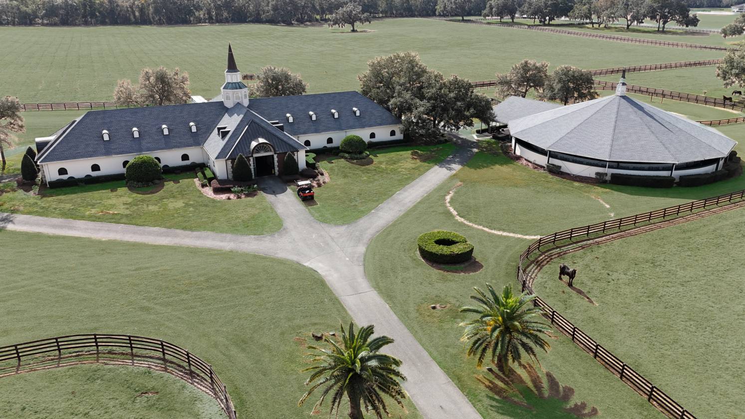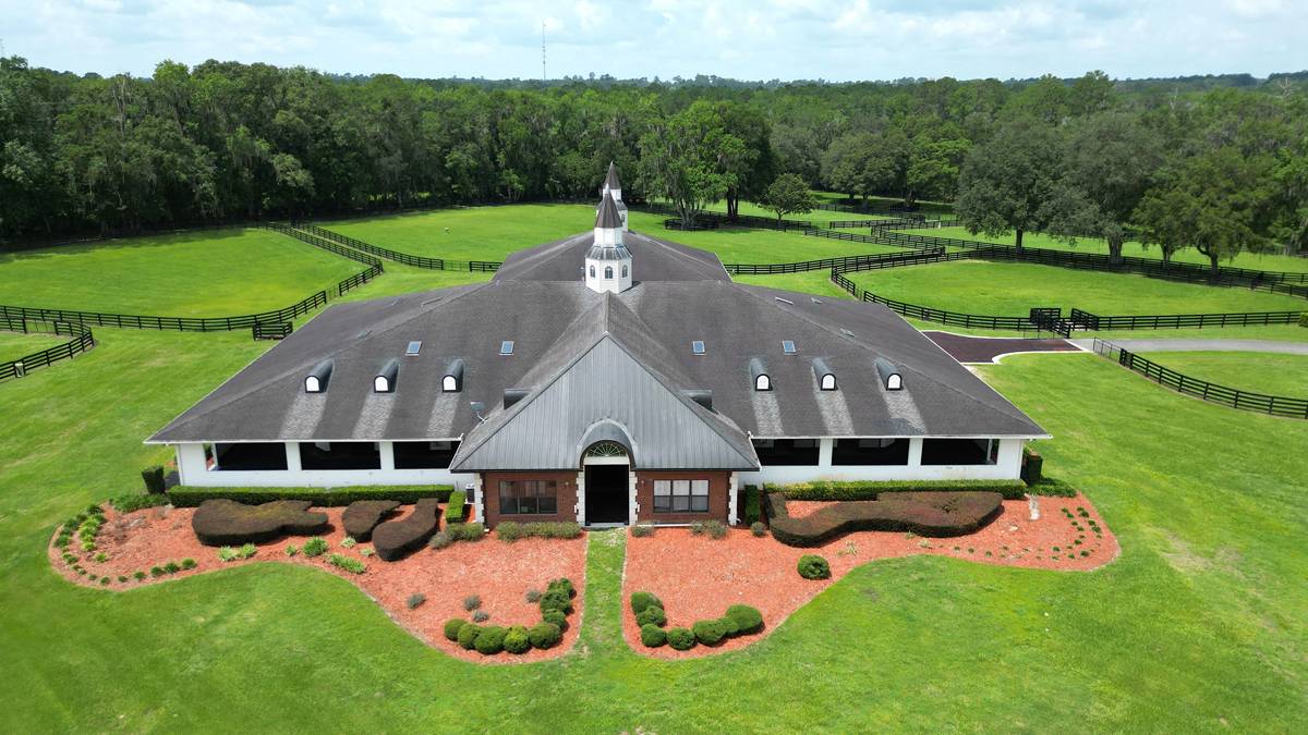 - This magnificent property spans 400+/- acres & offers state-of-the-art equine facilities professionally sculpted & architecturally designed for both function & elegance. This estate property is available, for an additional cost, with two simi-contiguous owner’s residence consisting of a 3.3.5 with a 1/1 apartment with 3,988 SF of living area, and a 4/3.5 with 2,428 SF of living area. Elegant office encompasses 3,984 +/- SF of superior craftsmanship, striking brick façade, & durable asphalt shingle roofing. Inside, you’ll find an elegant lobby/reception area, comfortable lounge/meeting room, & numerous private offices, including an executive CEO office complete with beverage bar & a private ¾ bath. Thoughtfully designed layout features a spacious conference room, copy/fax room, & kitchen/break area, complemented by a welcoming exterior-covered porch. The overall quality of construction is simply outstanding. The property has fiber optic internet cabling, offering modern connectivity amidst nature’s beauty. This exceptional farm includes a 5,400 +/- SF breeding barn featuring 6 premium stalls, a 13'x13' holding stall, and a dedicated observance/vet/office area. Open lab workspace & wash stall for mares further enhance the breeding experience. West wing of the barn is home to a generous 40’X40’ breeding shed, boasting a concrete floor cushioned with 1” thick rubber matting for the comfort of your equine horses. Excellent center-aisle quality construction with decorative cupola, copper accents and decorative small cupolas center-aisle. Adjacent to the breeding barn, stallion barns feature durable concrete block construction with charming brick accents and copper, highlighted by an elegant cupola. Each stable has seven spacious 16’X16’ stalls, wash areas with protective rubber matting, and dedicated tack/feed areas. Double-metal entrance doors boast top-notch hardware and decorative windows, ensuring style and functionality. The broodmare barn offers 27 stalls, including 24 generously sized 12’X12’ stalls and (3) 12’X17’ foaling stalls. With a 1/2 bath and a 1/1 apartment, this barn combines luxury with essential amenities. Experience the luxury of a training barn constructed with concrete block and adorned with elegant brick accents. Facility includes 23 premium stalls, (3) 12’X17’ foaling stalls, 1/2 bath, lab area, feed room, and an inviting 1/1 apartment. European free walker, with an inner covered riding area, & round pen surrounded by meticulously landscaped areas illuminated by uplighting