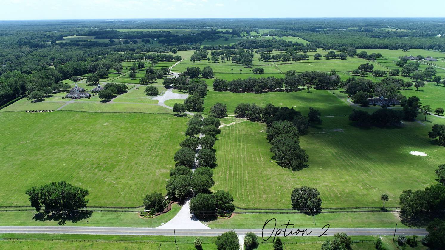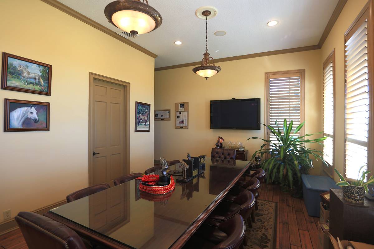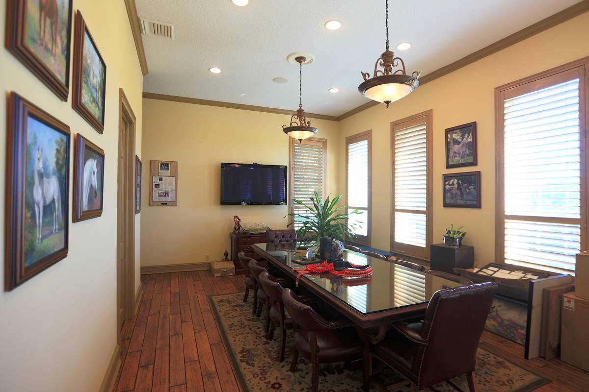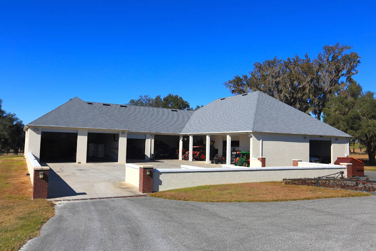- This magnificent property spans 400+/- acres & offers state-of-the-art equine facilities professionally sculpted & architecturally designed for both function & elegance. This estate property is available, for an additional cost, with two simi-contiguous owner’s residence consisting of a 3.3.5 with a 1/1 apartment with 3,988 SF of living area, and a 4/3.5 with 2,428 SF of living area. Elegant office encompasses 3,984 +/- SF of superior craftsmanship, striking brick façade, & durable asphalt shingle roofing. Inside, you’ll find an elegant lobby/reception area, comfortable lounge/meeting room, & numerous private offices, including an executive CEO office complete with beverage bar & a private ¾ bath. Thoughtfully designed layout features a spacious conference room, copy/fax room, & kitchen/break area, complemented by a welcoming exterior-covered porch. The overall quality of construction is simply outstanding. The property has fiber optic internet cabling, offering modern connectivity amidst nature’s beauty. This exceptional farm includes a 5,400 +/- SF breeding barn featuring 6 premium stalls, a 13'x13' holding stall, and a dedicated observance/vet/office area. Open lab workspace & wash stall for mares further enhance the breeding experience. West wing of the barn is home to a generous 40’X40’ breeding shed, boasting a concrete floor cushioned with 1” thick rubber matting for the comfort of your equine horses. Excellent center-aisle quality construction with decorative cupola, copper accents and decorative small cupolas center-aisle. Adjacent to the breeding barn, stallion barns feature durable concrete block construction with charming brick accents and copper, highlighted by an elegant cupola. Each stable has seven spacious 16’X16’ stalls, wash areas with protective rubber matting, and dedicated tack/feed areas. Double-metal entrance doors boast top-notch hardware and decorative windows, ensuring style and functionality. The broodmare barn offers 27 stalls, including 24 generously sized 12’X12’ stalls and (3) 12’X17’ foaling stalls. With a 1/2 bath and a 1/1 apartment, this barn combines luxury with essential amenities. Experience the luxury of a training barn constructed with concrete block and adorned with elegant brick accents. Facility includes 23 premium stalls, (3) 12’X17’ foaling stalls, 1/2 bath, lab area, feed room, and an inviting 1/1 apartment. European free walker, with an inner covered riding area, & round pen surrounded by meticulously landscaped areas illuminated by uplighting