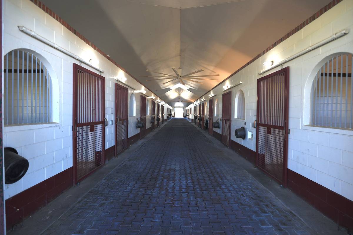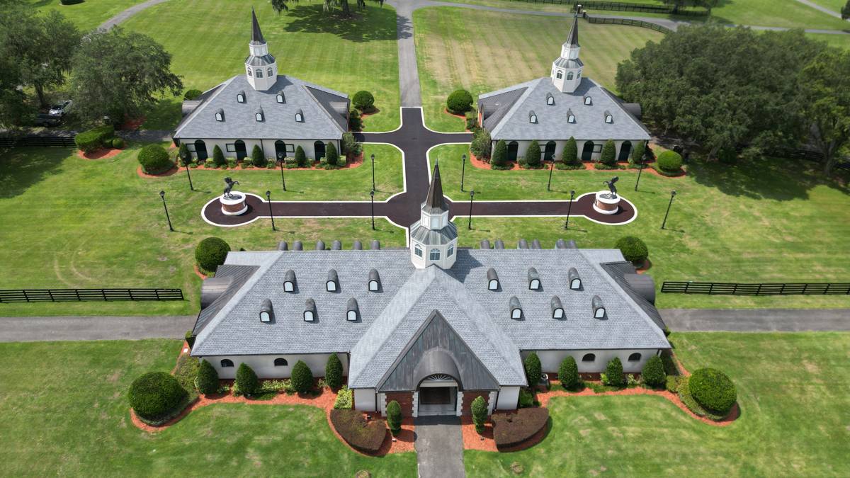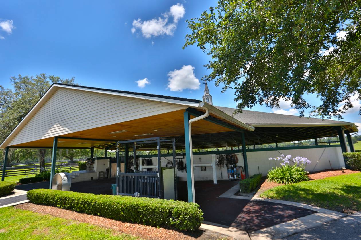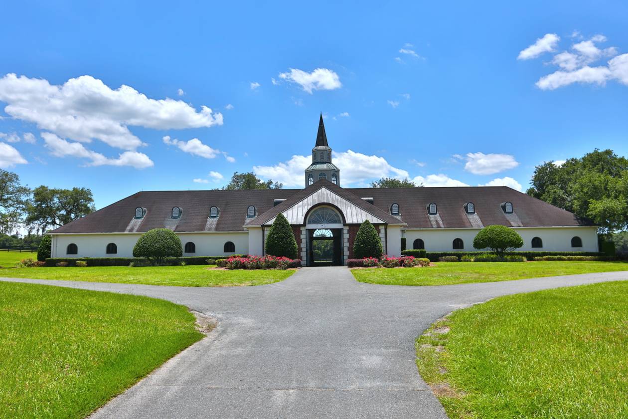 - This exceptional farm includes a 5,400 +/- SF breeding barn featuring 6 premium stalls, a 13'x13' holding stall, and a dedicated observance/vet/office area. Open lab workspace & wash stall for mares further enhance the breeding experience. West wing of the barn is home to a generous 40’X40’ breeding shed, boasting a concrete floor cushioned with 1” thick rubber matting for the comfort of your equine horses. Excellent center-aisle quality construction with decorative cupola, copper accents and decorative small cupolas center-aisle. Adjacent to the breeding barn, stallion barns feature durable concrete block construction with charming brick accents and copper, highlighted by an elegant cupola. Each stable has seven spacious 16’X16’ stalls, wash areas with protective rubber matting, and dedicated tack/feed areas. Double-metal entrance doors boast top-notch hardware and decorative windows, ensuring style and functionality. The broodmare barn offers 27 stalls, including 24 generously sized 12’X12’ stalls and (3) 12’X17’ foaling stalls. With a 1/2 bath and a 1/1 apartment, this barn combines luxury with essential amenities. Experience the luxury of a training barn constructed with concrete block and adorned with elegant brick accents. Facility includes 23 premium stalls, (3) 12’X17’ foaling stalls, 1/2 bath, lab area, feed room, and an inviting 1/1 apartment. European free walker, with an inner covered riding area, & round pen surrounded by meticulously landscaped areas illuminated by uplighting.