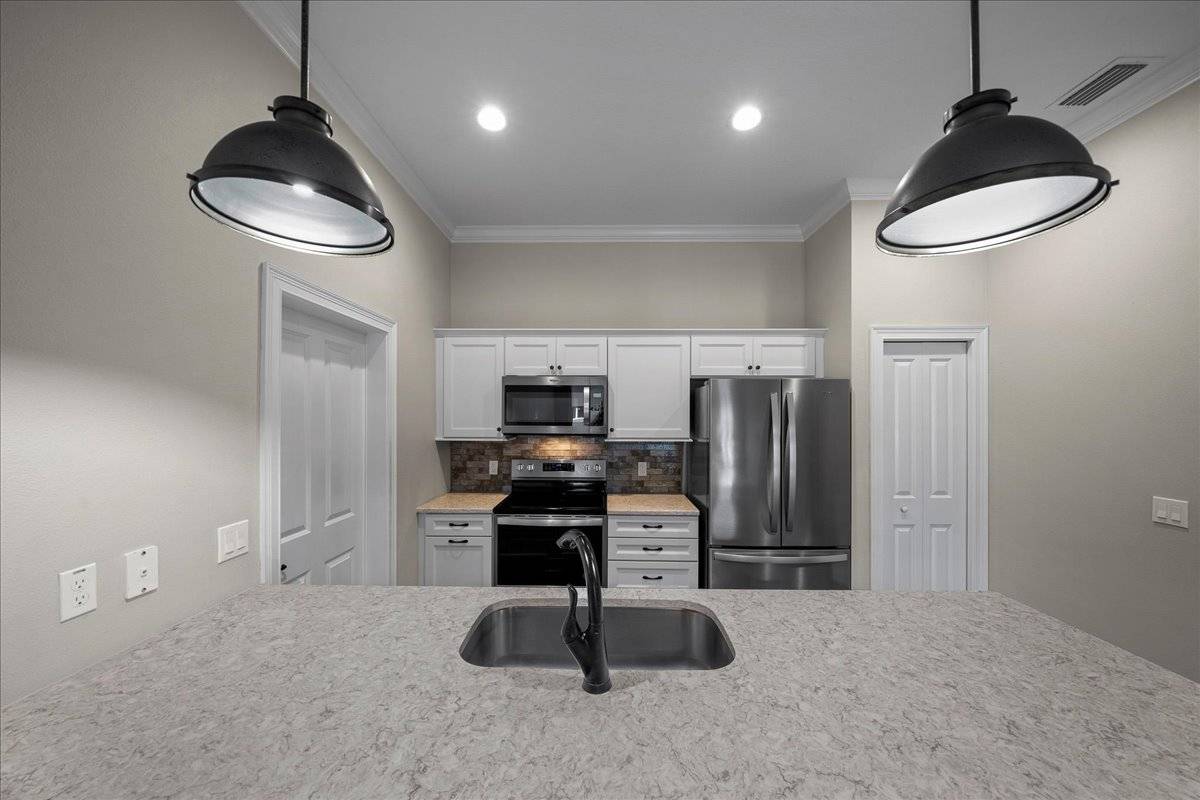 - • Kitchen w/ Quartz Counters, Stainless Appliances & Plantation Shutters