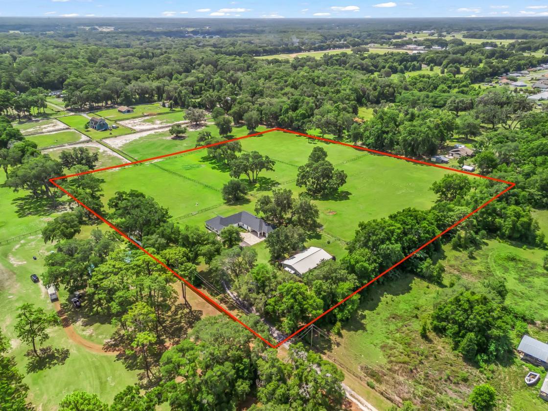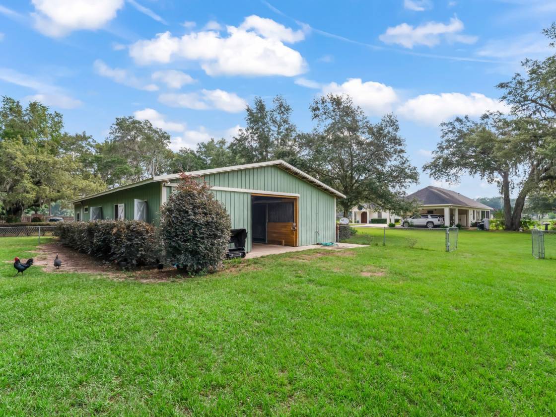 Welcome to this truly special 10-acre farm, a private and peaceful retreat perfectly located on a quiet dead-end road with direct ride-out access to the Florida Horse Park. Impeccably maintained and rich with character, this one of a kind property features a custom designed main residence, a beautifully appointed barn with apartment, and stunning grounds with manicured pastures—ready for your horses and your dreams. Step through the solid oak arched front door crafted by the Texas Door Company and adorned with an original 1800s fused glass medallion from Hilton Head into a home where art, history, and thoughtful design come together seamlessly. This custom built home features a light-filled living room surrounded by new Anderson windows and doors (2022) for breathtaking views of the property, plus remote-controlled storm shutters (2023) for ease and protection. A stunning gas fireplace insert is a (2022) Victorian unit from Canada and will provide heat to the entire living space. An open-concept kitchen with 42” cherry cabinets, granite counters, deep base drawer storage, large pantry, and a solar tube for natural light. Elegant art lighting throughout for showcasing collections. A laundry room with deep sink, oak cabinetry, and stacked washer/dryer, conveniently located near the half bath and screened rear porch. Enjoy relaxing on the back screened-in porch complete with a 2022 Caldera 7-person spa with waterfall, and an outdoor shower—ideal for Florida living. The home includes two beautifully appointed bedroom suites: The primary suite features a luxurious bathroom with dual vanities, zero-entry rain shower, Bain hot air-jet garden tub, bidet seat, and heated towel rack. The garden suite (perfect for in-laws or guests) includes its own private entrance, media center, surround sound with large TV, full bath with zero-entry shower, home office area, large closet, and private access to the carport and porch. Many interior doors are solid oak, fitted with original hardware and stained-glass transoms—all relocated from the family’s historic 1835 home, preserving charm you can’t replicate today. This home is energy efficient and built to last. With spray foam insulation in the attic and exterior walls, a blue light HEPA filtration for the main part of the home. Most recent updates include, tankless water heater, RO system, new Generac generator with buried propane tank, new roof, LVP flooring, outdoor kitchen ready wiring on back patio, HVAC system and new electric panel for the Garden suite all added in (2022) The well-appointed barn includes, a fully updated (2020) 2-bedroom, 2- full bath apartment with open plan (864 sq ft), new flooring, and windows. 5 stalls (12x12), with two convertible to 12x24, tack room and wash rack. Behind the barn is a chicken coop, separately fenced in small animal barn, and shipping container for extra storage. 4 lush pastures with automatic waterers and large run-in shed dotted perfectly with oak trees. Ride out directly to the Florida Horse Park and enjoy proximity to all that Ocala has to offer, while basking in the serenity of country living. Every inch of this farm reflects pride in ownership and an appreciation for quality and heritage. This is more than a property—it’s a story, a sanctuary, and a rare opportunity. Move-in ready and ready to inspire.