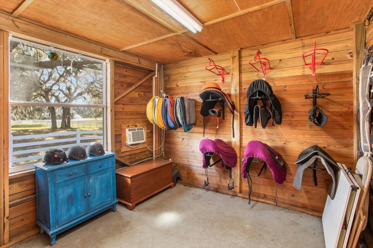 - • Air-conditioned tack room & barn bathroom & large storage space for farm equipment