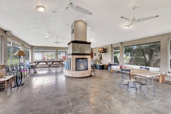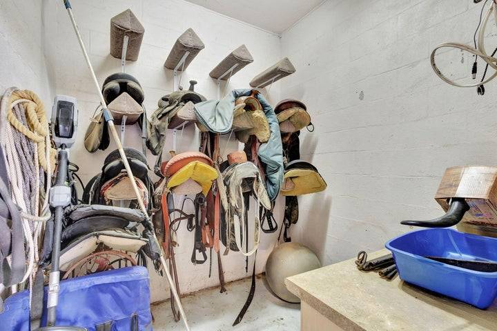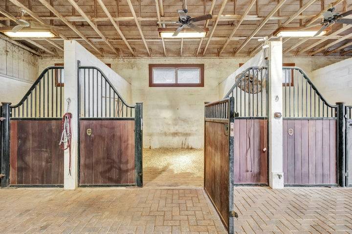 - Concrete Barn, European Stall Fronts, Tack and Feed Room, Wash Racks, Full Bathroom and Washer and Dryer in Barn, Storage Lockers in Barn, Riding Arena, Covered Manure Bin, Round Pen, Water in Paddocks,