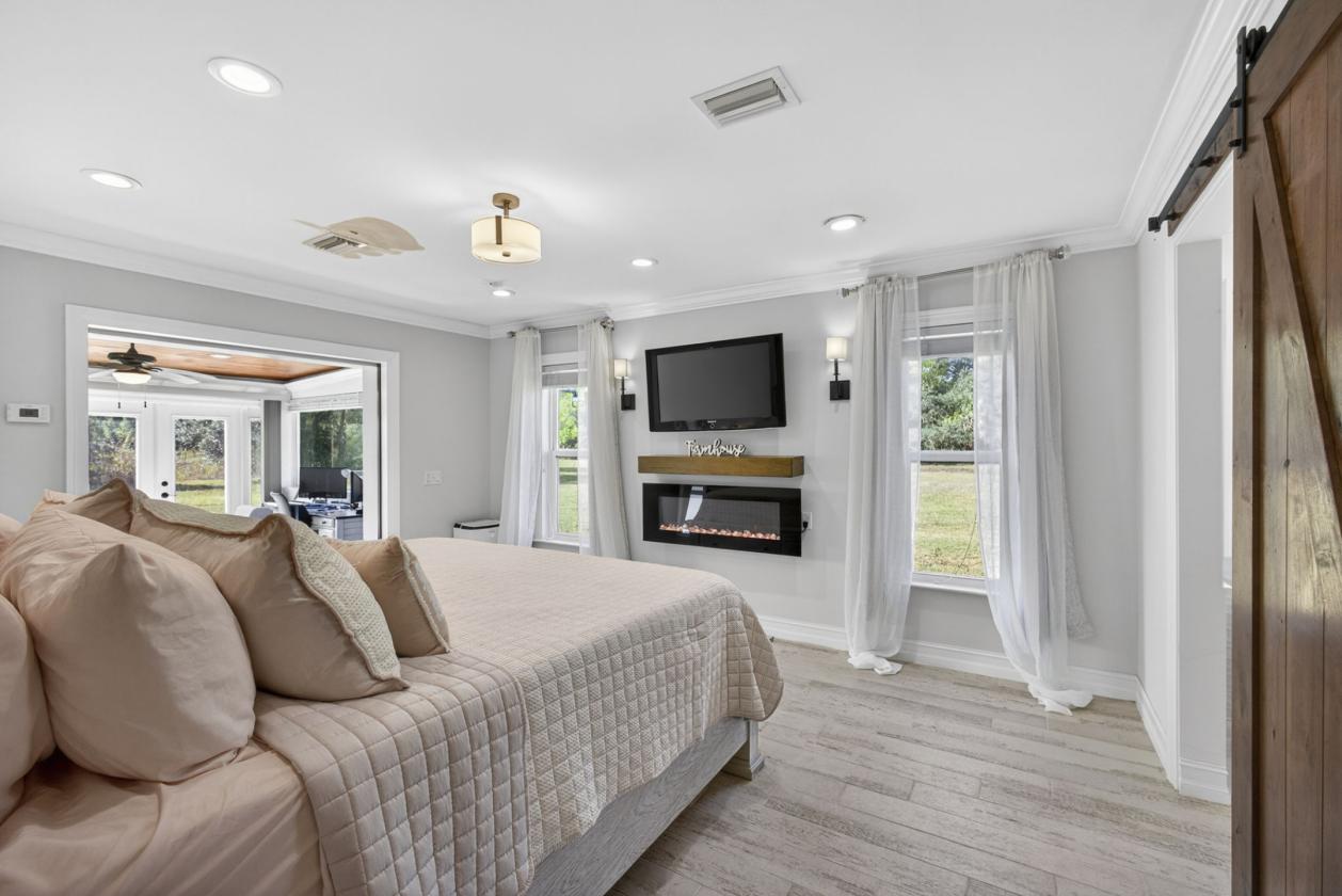 - The split floor plan provides ideal privacy. The expansive master suite boasts wall-to-wall picture windows that fill the room with natural light, plus a bonus space that can serve as an office or private retreat. This additional area includes its own kitchenette with a sink, countertop, dishwasher, and stove an incredibly unique feature. The luxurious master bath impresses with barn doors, a freestanding soaking tub, and a rainfall shower with a jet system for a true spa experience.