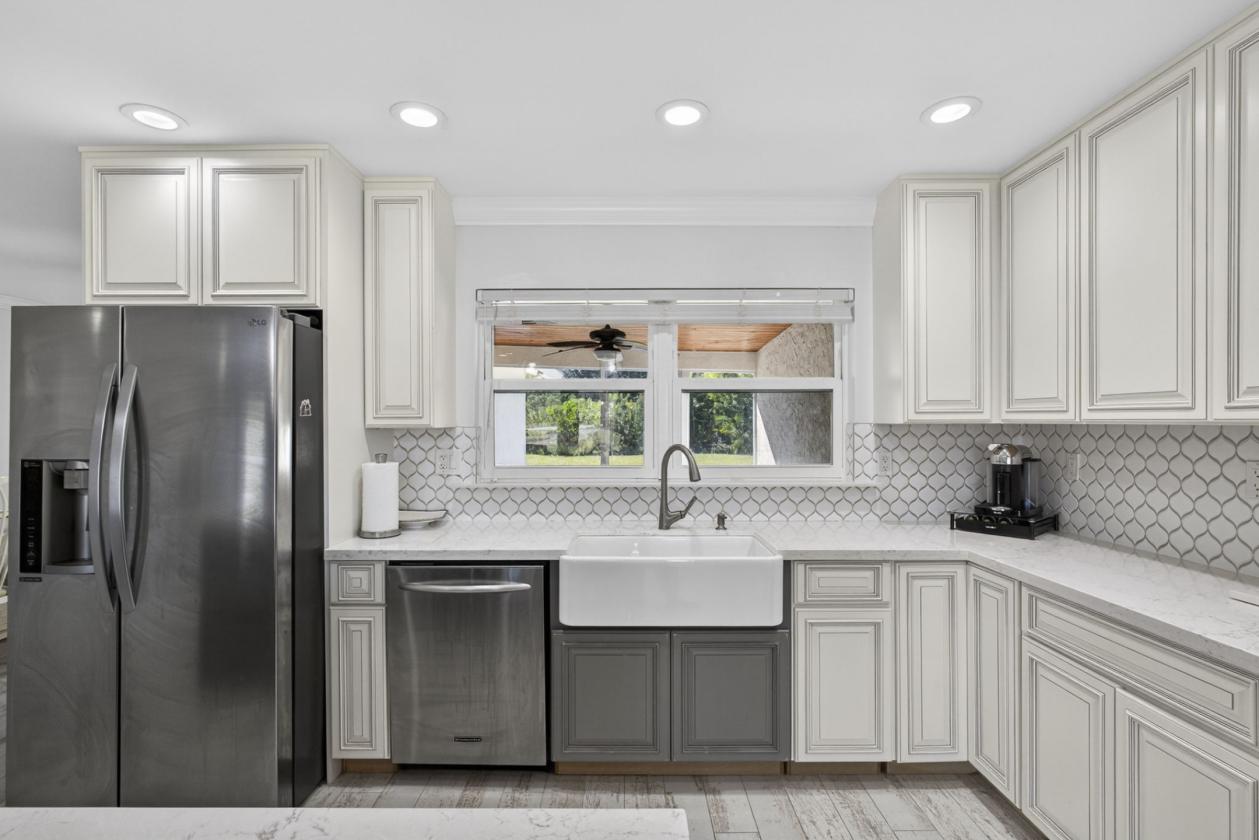 - The heart of the home is the gorgeous chef's kitchen, featuring new cabinetry, quartz countertops, Stainless Steel appliances, a spacious island, a large pantry with pull-outs, a farmhouse sink, and even a wine cooler, perfect for entertaining.