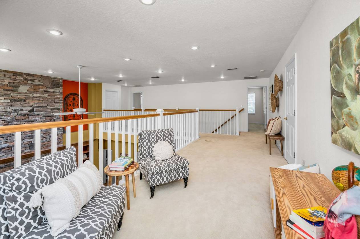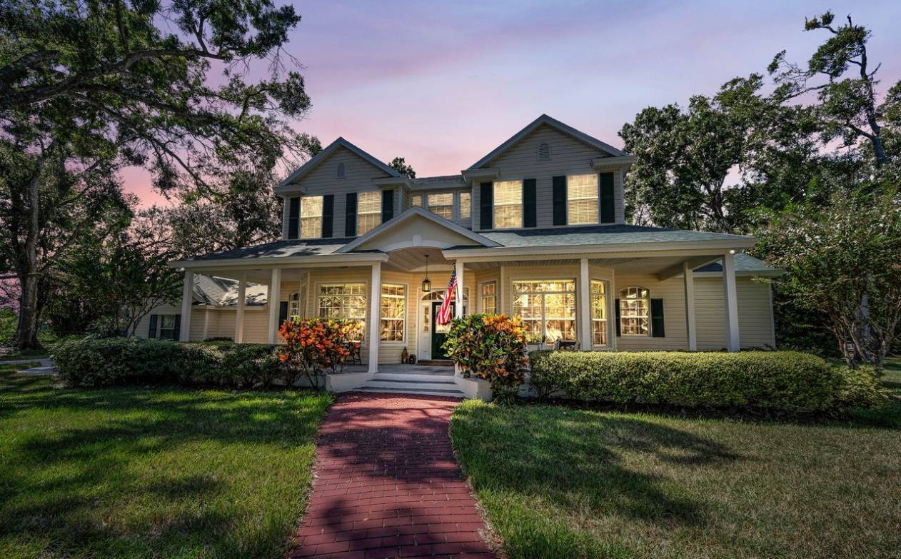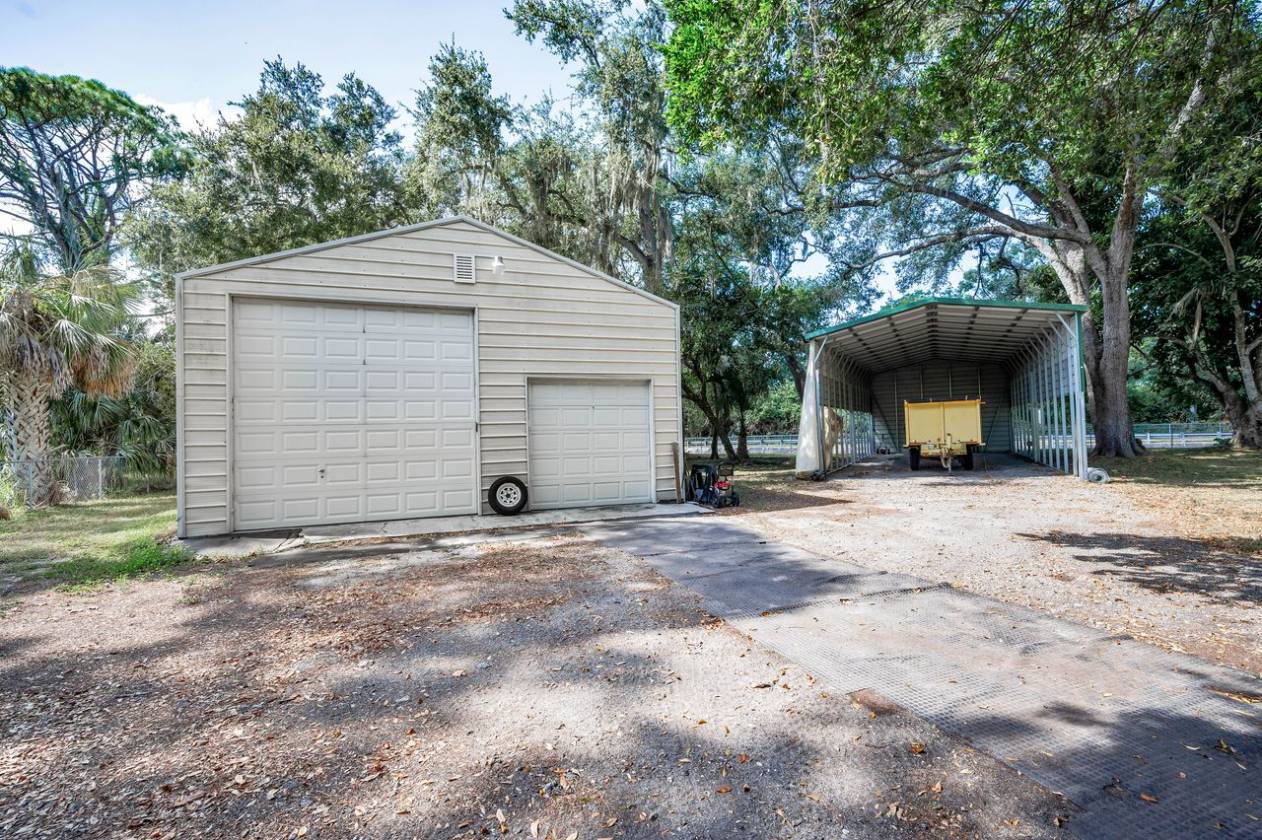 Nestled in the heart of Pinellas Park's equestrian community, this stunning home sits on 3 acres, offers 4 bedrooms, 2.5 bathrooms, with ample living space and numerous amenities. The generously sized primary suite features an impressive double-sided stone fireplace that connects to the living room. The primary suite includes an adjacent bedroom which would work well as a home office, home gym, or potential nursery. The home boasts a large loft area, perfect for a home office, hobby room, or additional living space. The 2 upstairs bedrooms share a Jack & Jill bathroom, providing convenient access and privacy. A bonus room offers additional storage space. The kitchen features window seats that offer even more storage space. The living room showcases custom built-in shelving, adding both style and functionality. The home is equipped with double-pane windows, an HVAC system that is 3 years old, and a roof that is 2 months old, ensuring energy efficiency and comfort. The covered front and rear porches invite you to relax and enjoy the outdoor environment. The 3-car garage provides ample storage and parking. The gated property is completely fenced, with a large outdoor firepit and covered RV parking that includes a 50-amp hookup. A detached garage, with 3 electric roll-up doors, provides additional storage and workspace options. The small shed near the rear garage is climate-controlled, making it suitable for use as a kennel or chicken coop, complete with its own fenced area. The property is zoned for horses, close to riding trails, and has potential for expansion with zoning for a guest home. The long circular driveway provides ample parking and easy access to the home. Don't miss out on the opportunity to makes this stunning home yours!