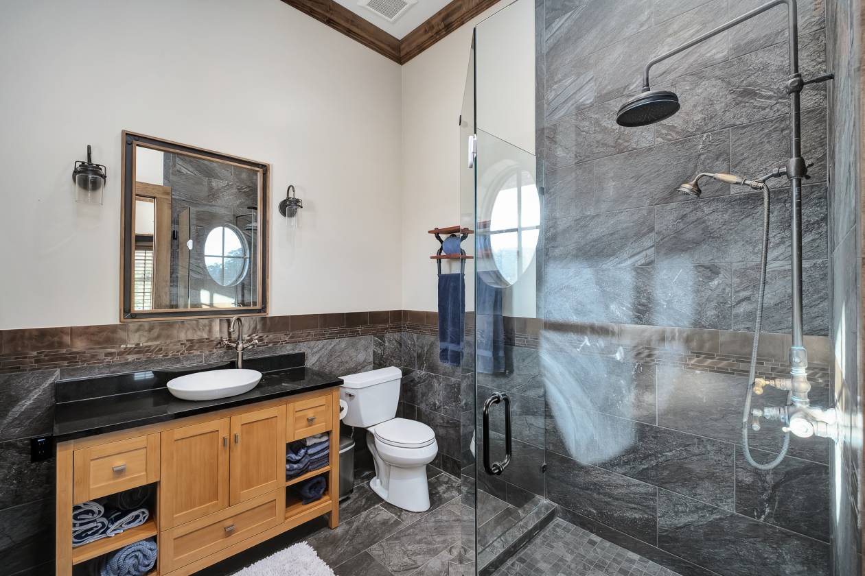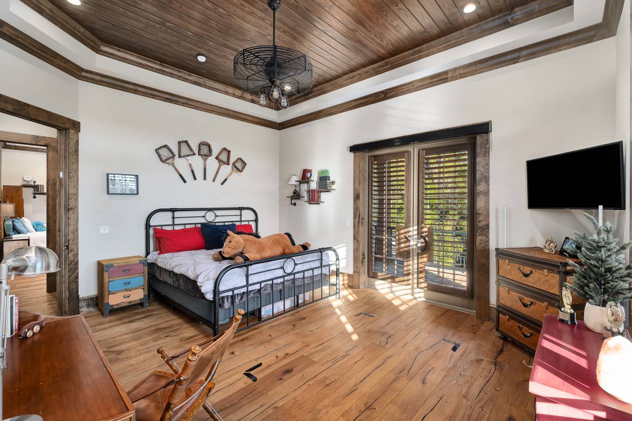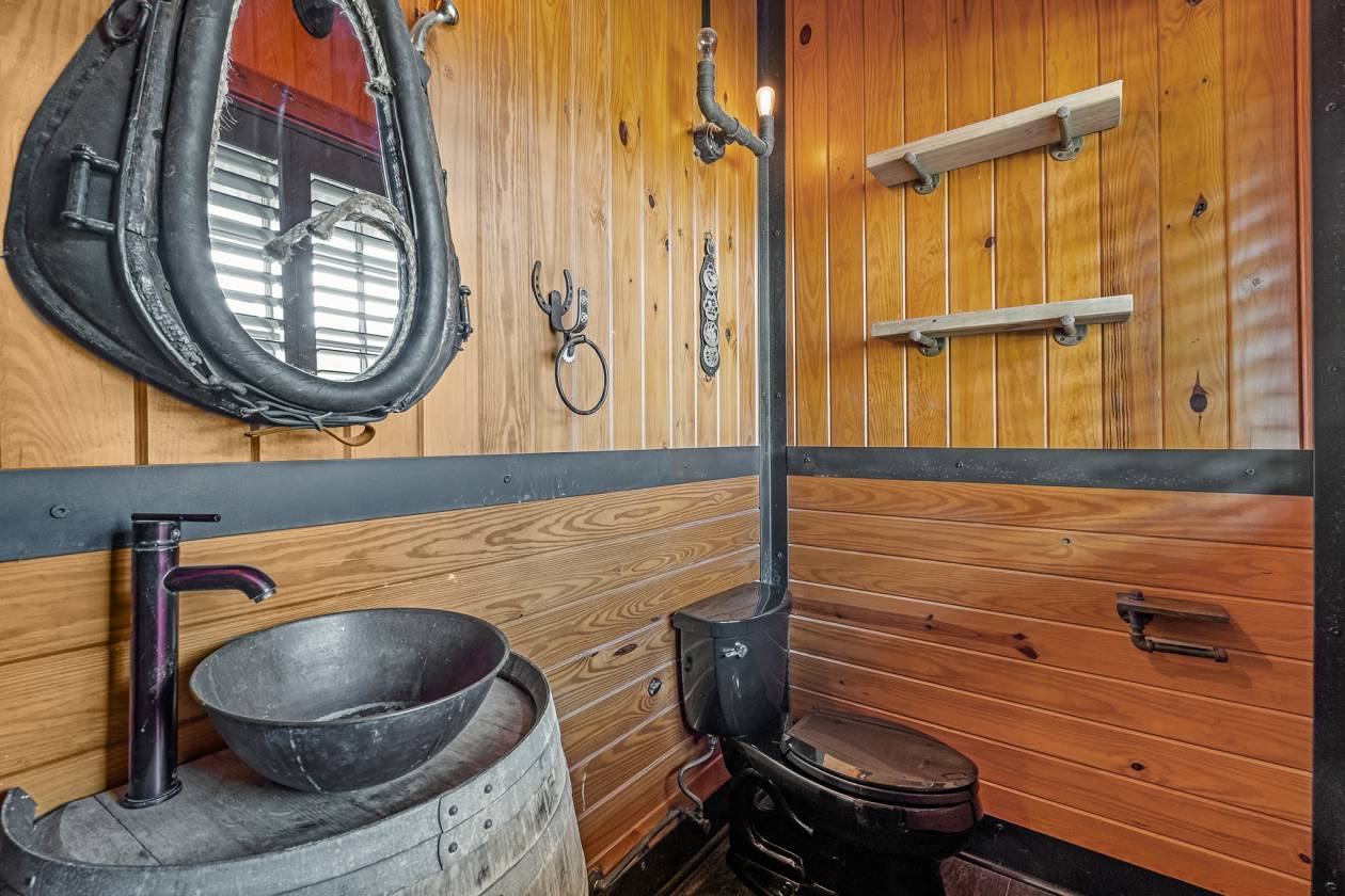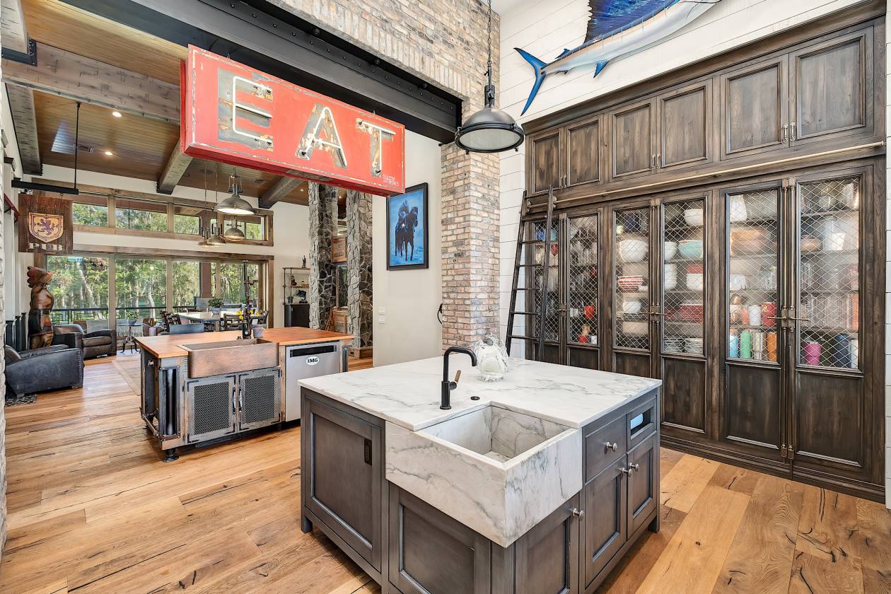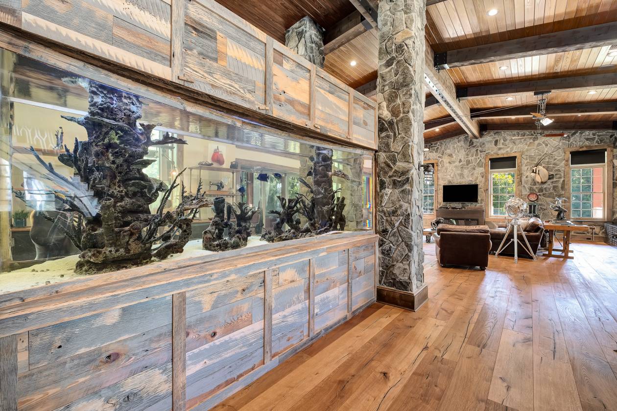 - Walking into the grand two-story entry you’ll find a circular staircase, a glass wall showcasing the wine cellar, and an impressive 1400 gallon saltwater aquarium, which is the anchoring centerpiece visible from multiple rooms. From the entry you will be awed by the Aspen-lodge-inspired main living area, which has beautifully crafted tongue-and-groove ceilings, exposed beams, industrial hardware detailing and stone architectural columns, all adding depth and character to this warm rustic ambiance. French doors lead into a private study with ample natural light and a steel safe. A vault-style door provides a dramatic entrance to the walk-down wine cellar with exposed brick and wood giving off Old World charm. The guest bath has a steampunk-inspired pedestal sink crafted from industrial copper piping and riveted hardware.