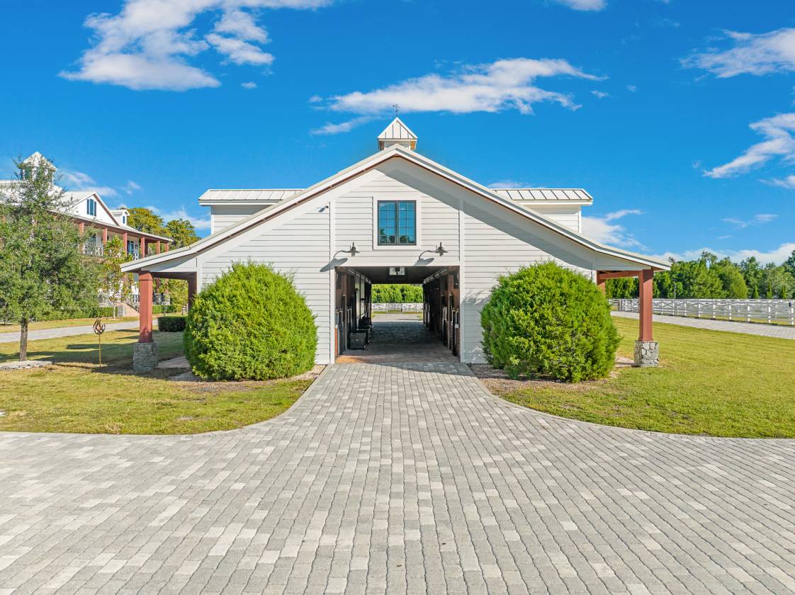 - Beyond the gated stone entrance, a brick paver driveway connects the main residence, garage, guest house, barn, and arena in a graceful sweep through manicured lawns and open paddocks. Mature trees frame the landscape and create a natural privacy buffer, giving the entire property a sense of quiet seclusion.