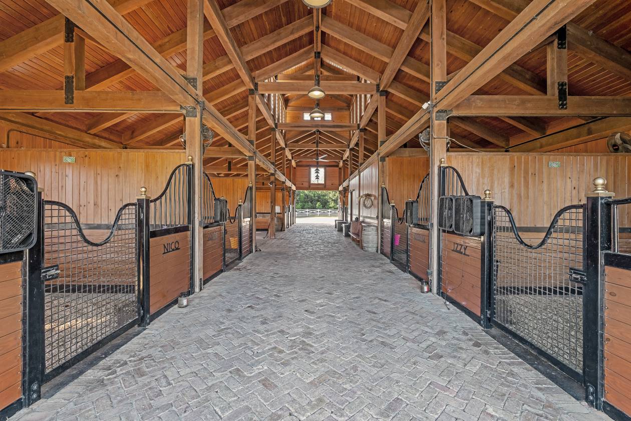 - The center-aisle barn reflects the same craftsmanship as the home, featuring eight oversized, matted stalls, automatic waterers, spacious and well-appointed tack room with half bath, oversized wash bays, and ample storage. Chicago brick flooring, high ceilings, and generous airflow create an ideal environment for horses. Just beyond the barn lies an outdoor arena surrounded by multiple fenced paddocks for training and turnout.