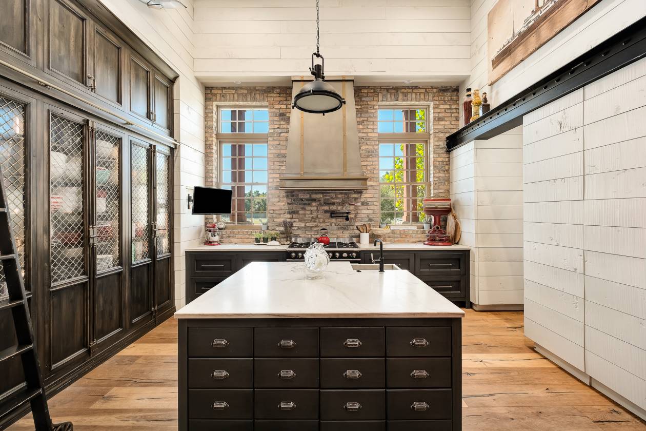 - A chef’s kitchen features professional-grade appliances, marble counters with custom wood cabinetry, multiple refrigerators and a charming farmhouse-inspired pantry with brick pavers and ample counter space for staging, prep and a coffee bar. The kitchen area seamlessly flows from a large indoor dining area to an outdoor kitchen and grilling area—perfect for entertaining. A curated lounge adds a unique space for entertaining; with its reclaimed wood accents, vintage inspired decor and custom lighting it is the perfect space for conversations, cocktails, and displaying prized possessions. The purpose-built family entrance from the detached garage has simple functionality for daily household organization in mind with wall cubby storage, a versatile central island, and walk-in closet.