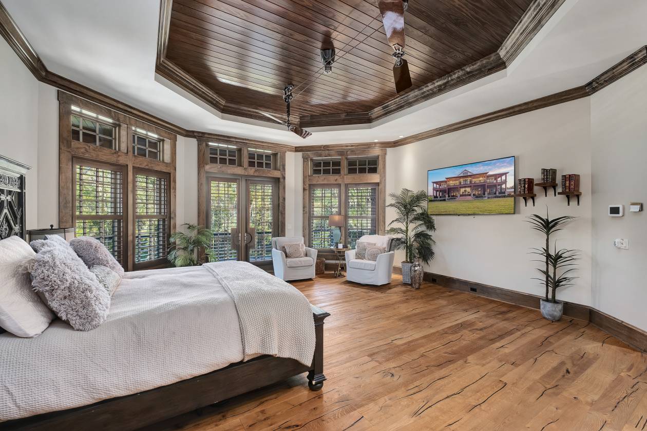 - Upstairs, the primary suite offers quiet luxury with dual walk-in closets and fine finishes, one of which is a boutique-style dressing room featuring frosted floor-to-ceiling built-ins with a dedicated vanity. This floor also provides three additional bedrooms, each with their own full bathroom, custom built-in closets, electronic curtains and french doors that lead out onto the wrap around porch. Each family member or guest can have their own private outdoor sitting area for enjoying the views overlooking the grounds.