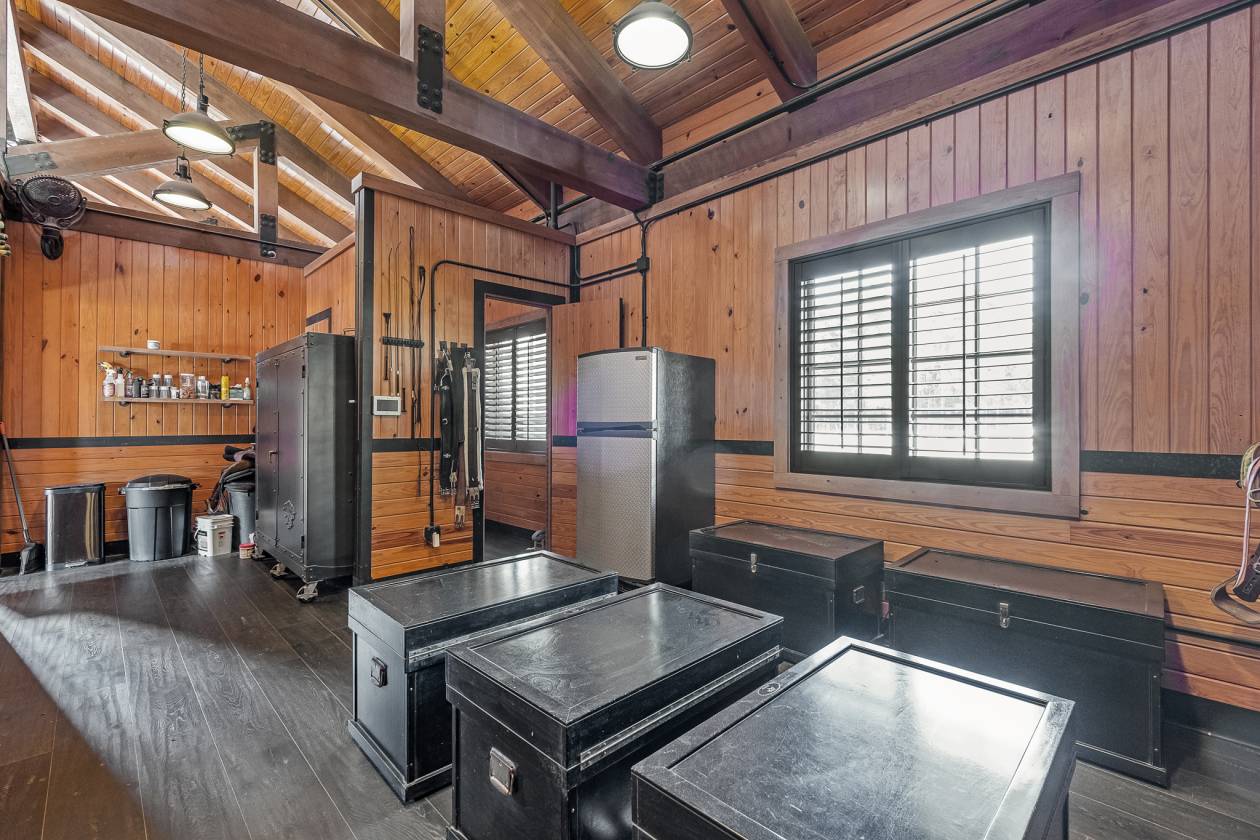 - A secondary garage and storage building includes an upper-level studio space currently used as a guest room, with completed plans available for conversion into a full guest cottage, photography shows a possible virtual representation. A detached multi-bay equipment building adds practical capacity for vehicles and maintenance while maintaining the estate’s cohesive, polished aesthetic.