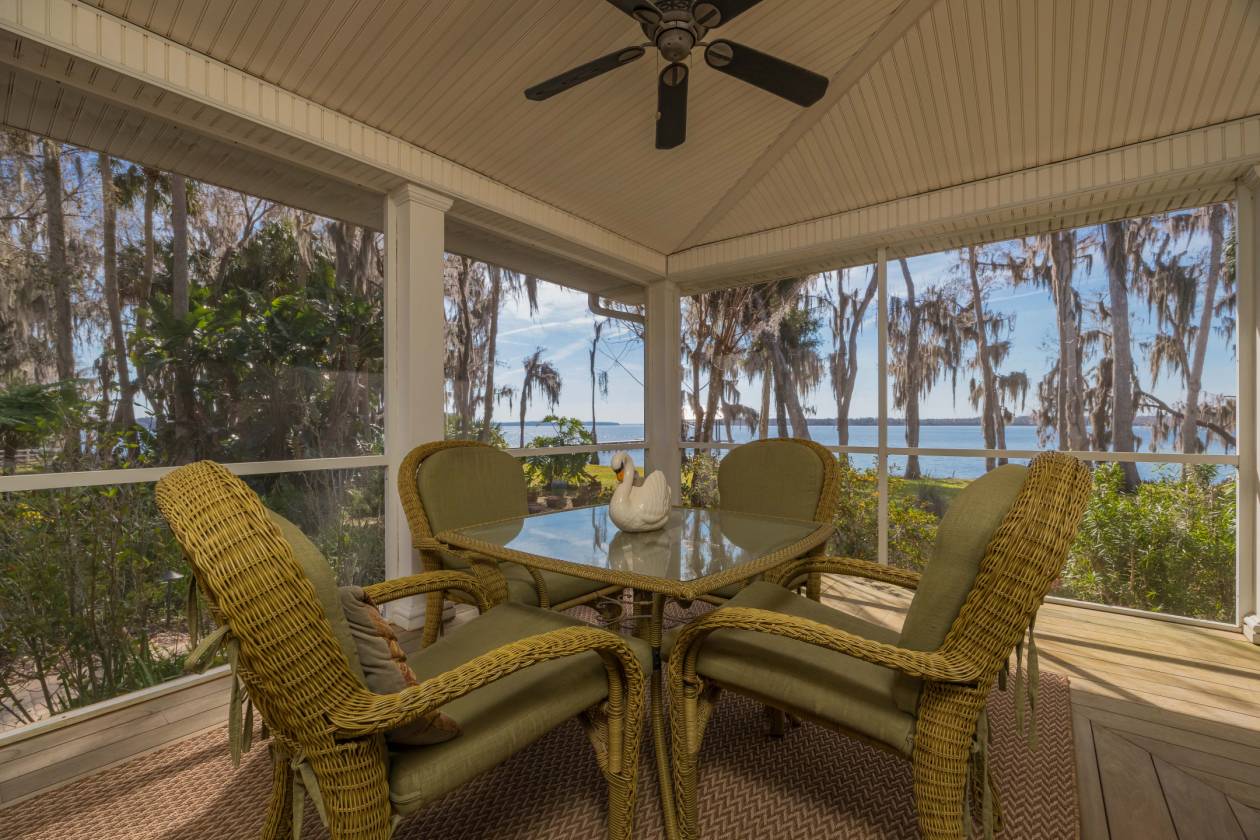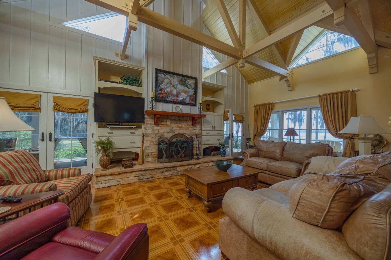 - Rich wood parquet flooring throughout. Spacious kitchen with lots of cabinets & counters, breakfast bar, gas stove & views of the river. 2 hallways with wood molding. 1 hallway leads to pantry & huge 12x12 laundry rm with lots of cabinets & counters, large sink & door to the front wraparound porch. Other hallway leads to double French doors to owner suite with many windows for tranquil river views, huge bathroom with river view & walk in closet with 2 gun safes, plus a private sun porch filled with more tranquil river views. The 2 stall horsebarn is in a gated fenced pasture with a pond & a chicken coop. The 3 stall horsebarn also has a carport for your own Hurricane boat. Views are breathtaking!! Across the river you will see Ocala National Forest, Hog Island and Drayton Island. This is truly PARADISE!