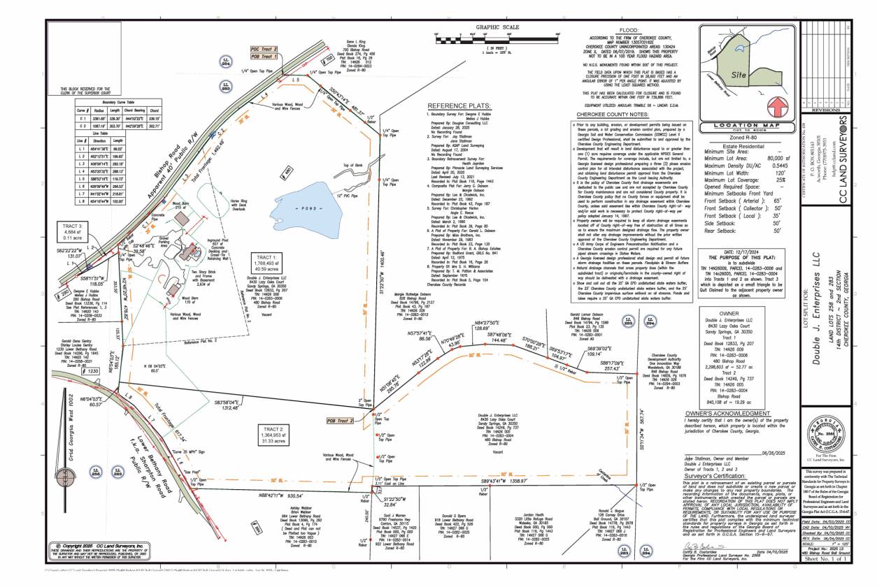 72 +/- acres that can be split; 41 +/- acres including farm area with house and barns; 31 +/- acres for proposed subdivision which proposes 12 single family estate-sized lots of approximately 2 +/- acres meeting current R80 zoning. Utilities are available; sewer is septic. Tract is located 2.75 miles from 575. Northside Hospital Cherokee, Publix, Home Depot, target and many other retailers and retaurants are located within a 5-mile radius to property off 575 South; Exit 19. Property is located in the Cherokee County school district,