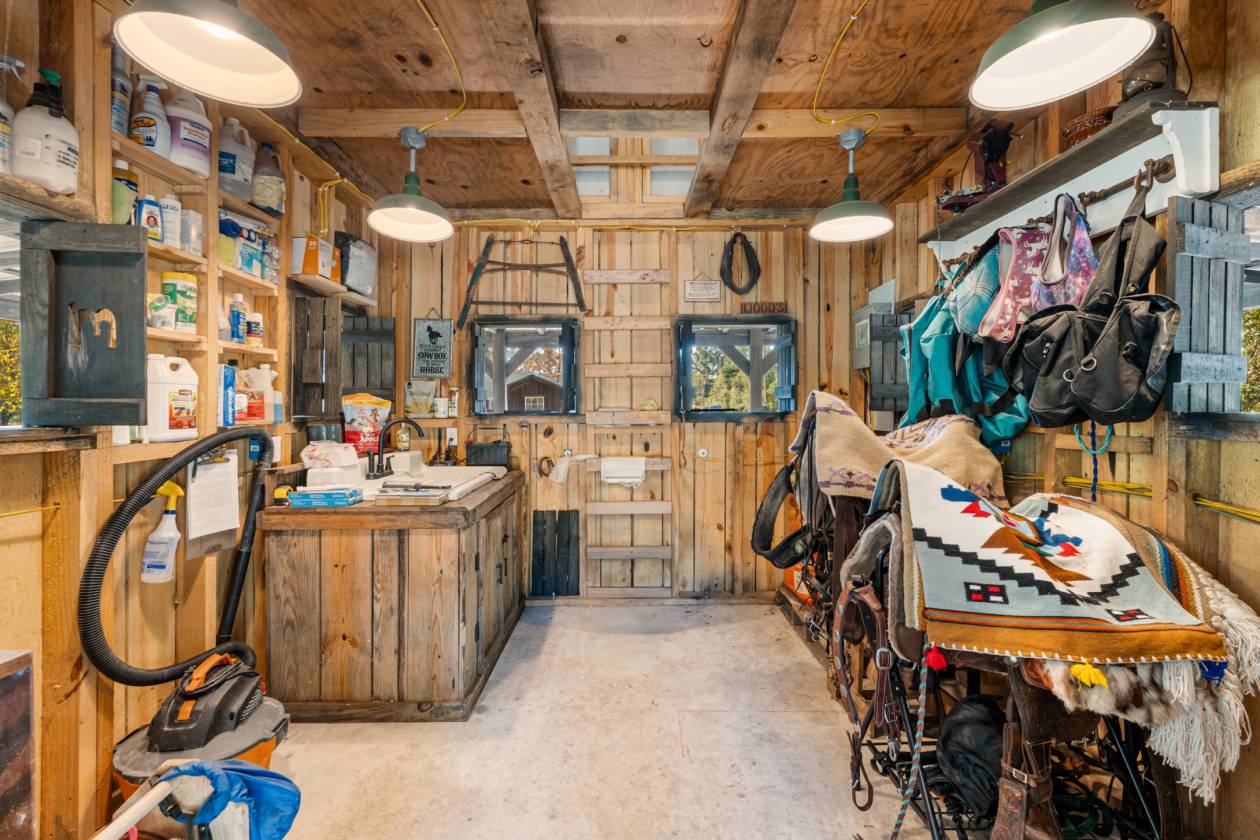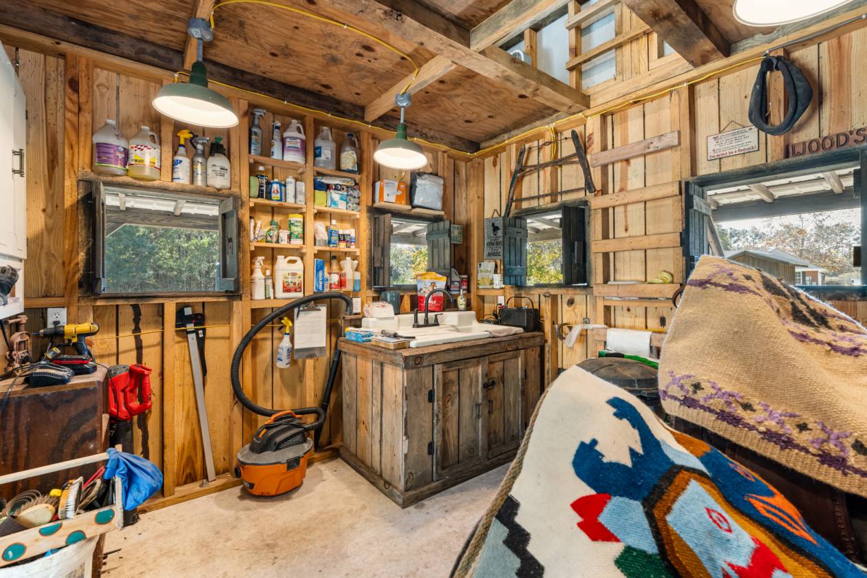 - Tack and feed room is 10*10 with a concrete floor, complete with an antique sink