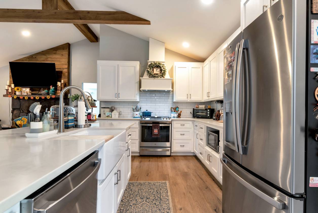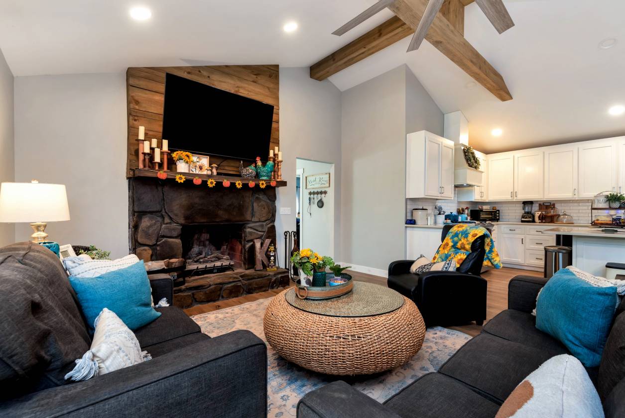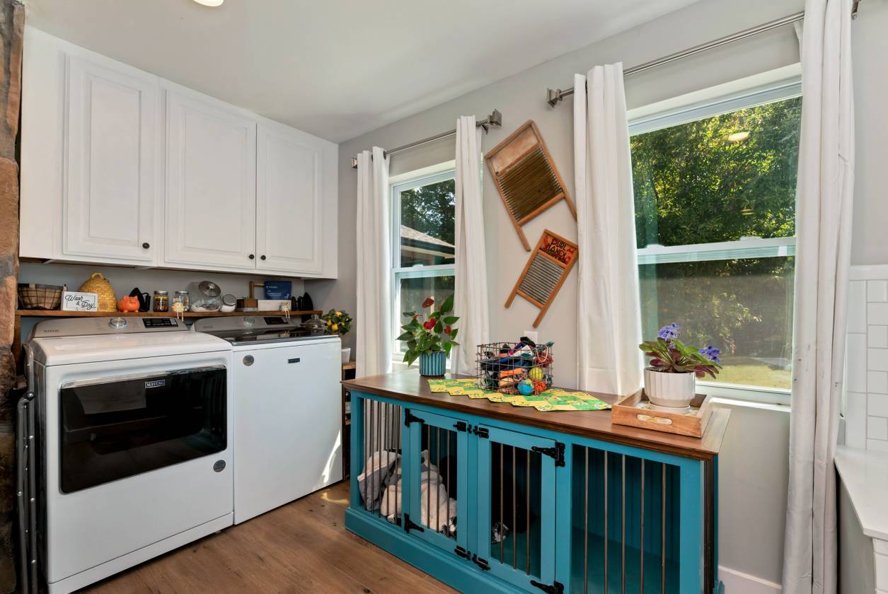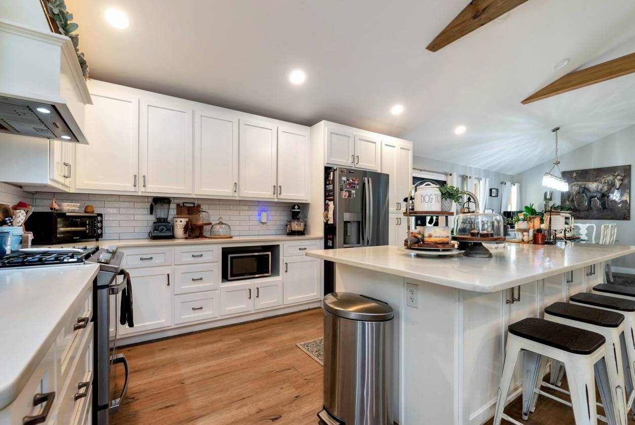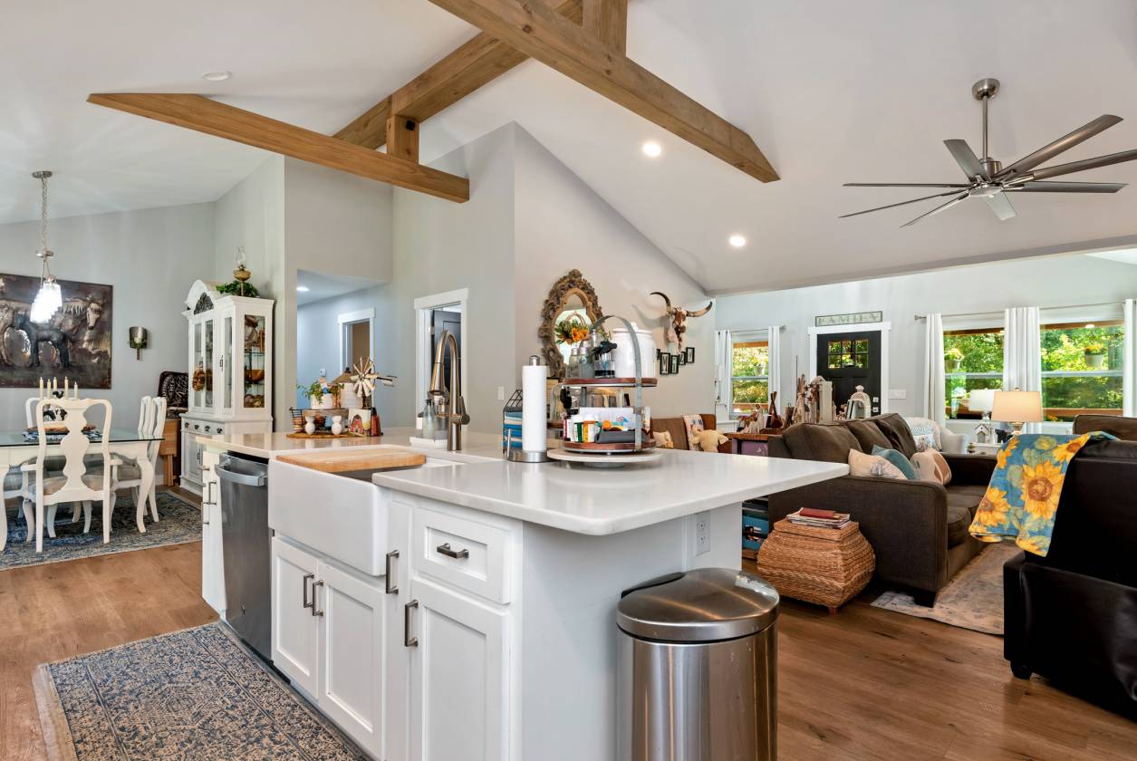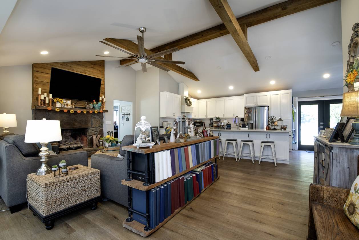 - The home features 3 bedrooms and 3 baths on a partial unfinished basement. The beautiful open concept family area features tall ceilings, beams, large fire place, custom kitchen with island, dining area, and foyer area that makes a great office space or reading nook!! The master bedroom has beautiful glass doors that open to the side deck overlooking the pasture! Large custom en-suite bath and closet is an additional bonus!! The laundry area is tucked behind the mud-room/entry way and has a has a pet shower for your fur-babies!! Off the back deck is a cozy fire-pit area for those cool evenings!!