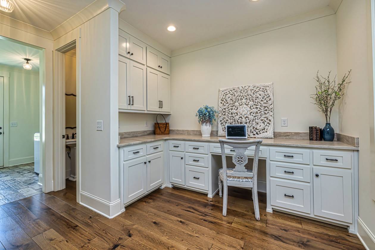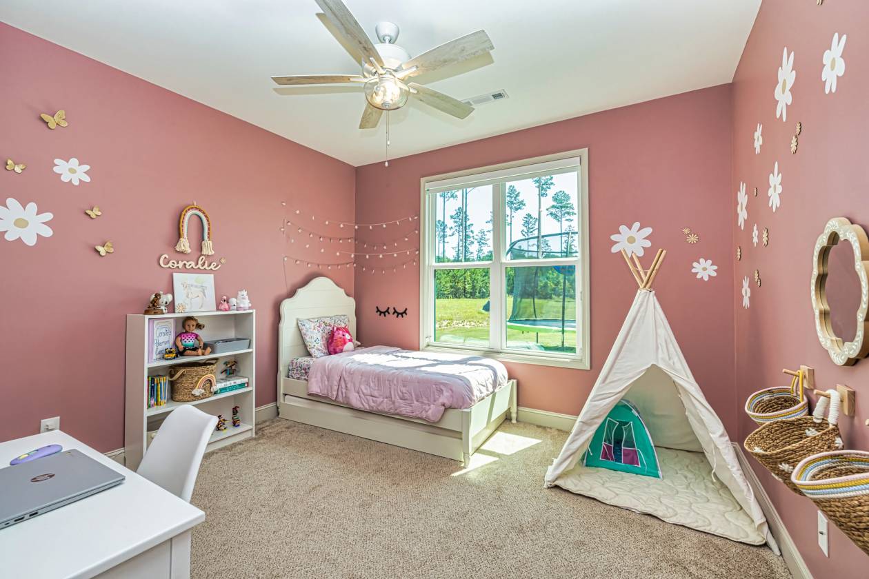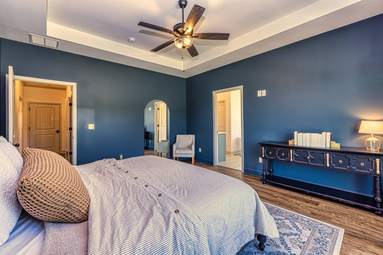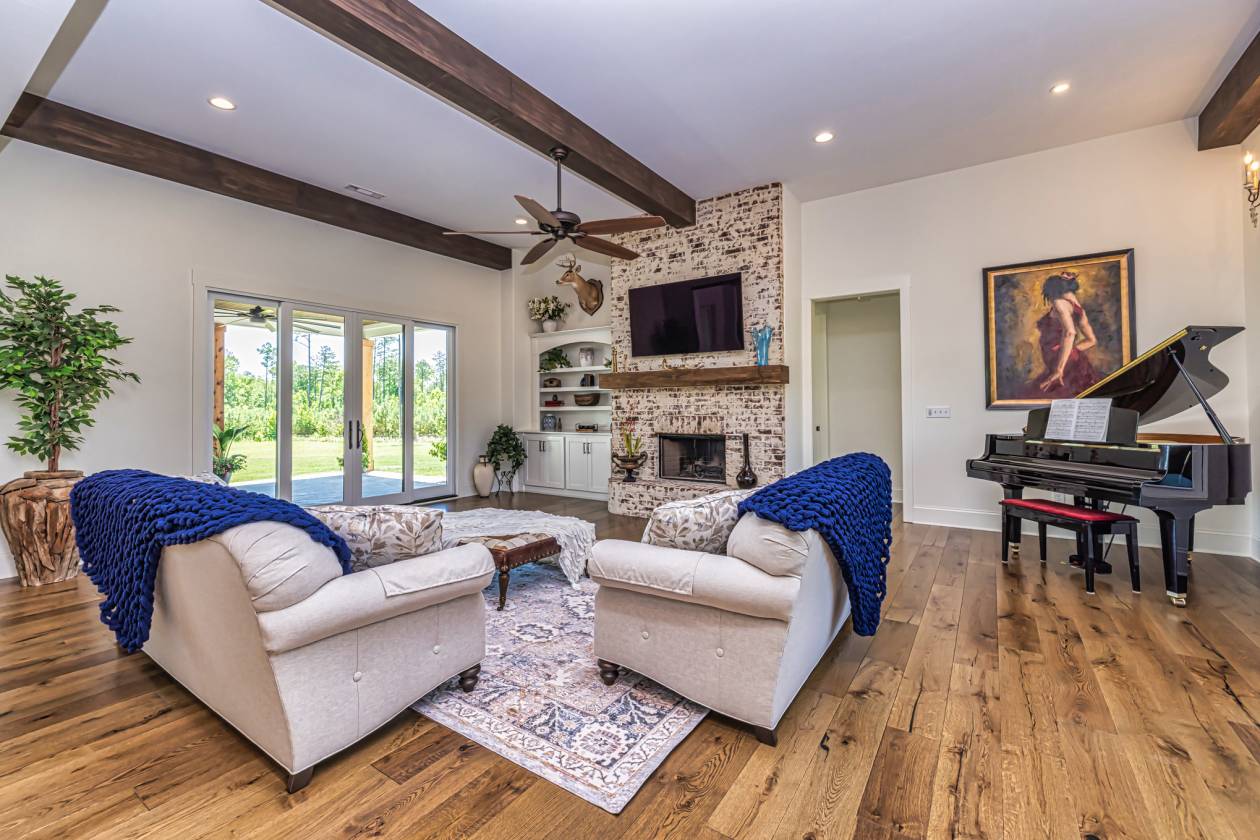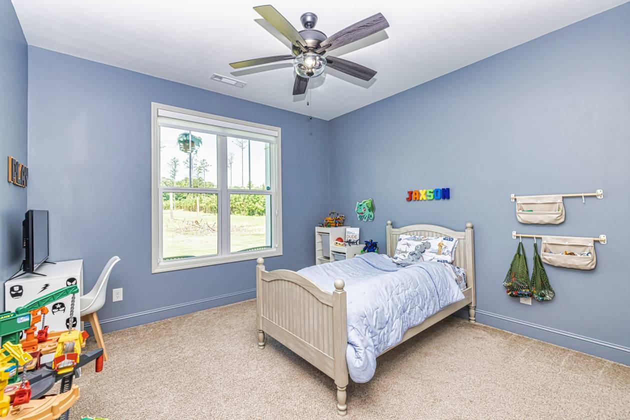 - The primary suite is a private retreat with vaulted wood-beam ceilings, shiplap accents, a spa-style bath with soaking tub and separate shower, and a custom walk-in closet with built-in window bench. Secondary bedrooms share a Jack-and-Jill bath, while an upper-level bonus/bedroom with full bath offers flexible space for guests, office, or recreation. Additional highlights include an oversized 3-car garage, foam insulation, mudroom, and a welcoming rocking-chair front porch.
