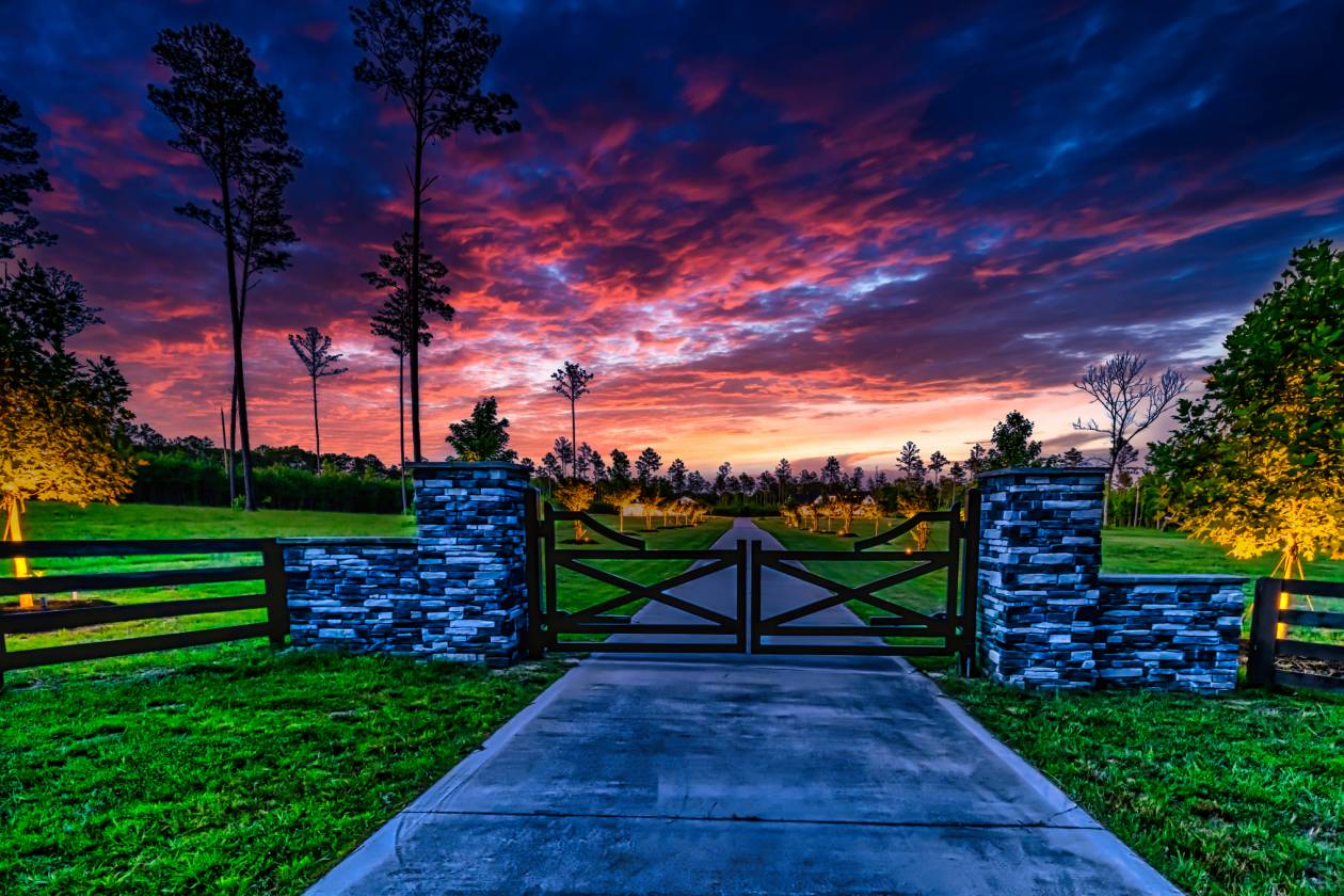 - The property features a gated entrance and tree-lined, professionally lit driveway, creating a grand approach. Infrastructure includes two high-capacity wells, a 20-zone irrigation system, and custom outdoor lighting, ready to support animals, landscaping, or future development.