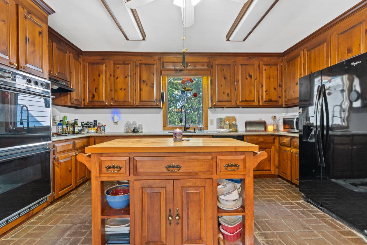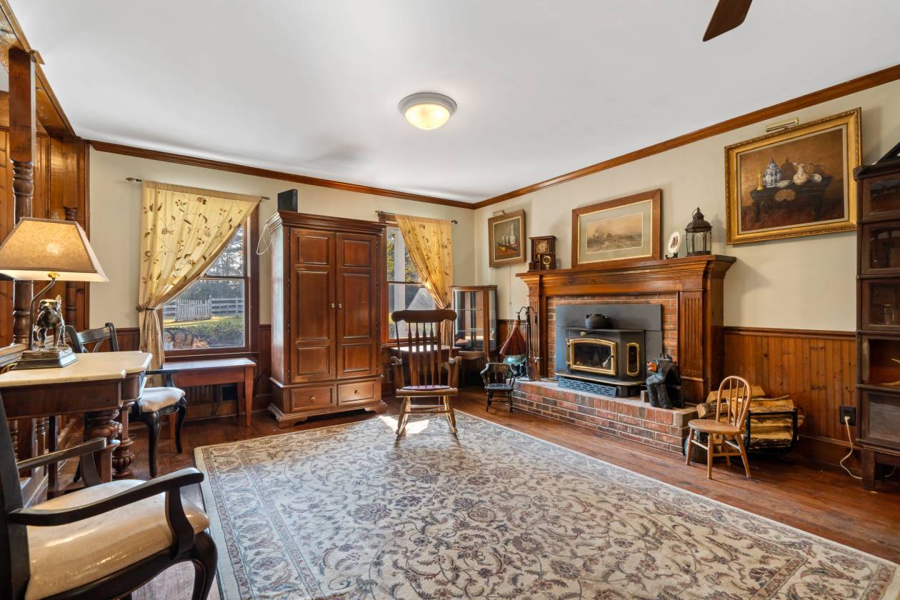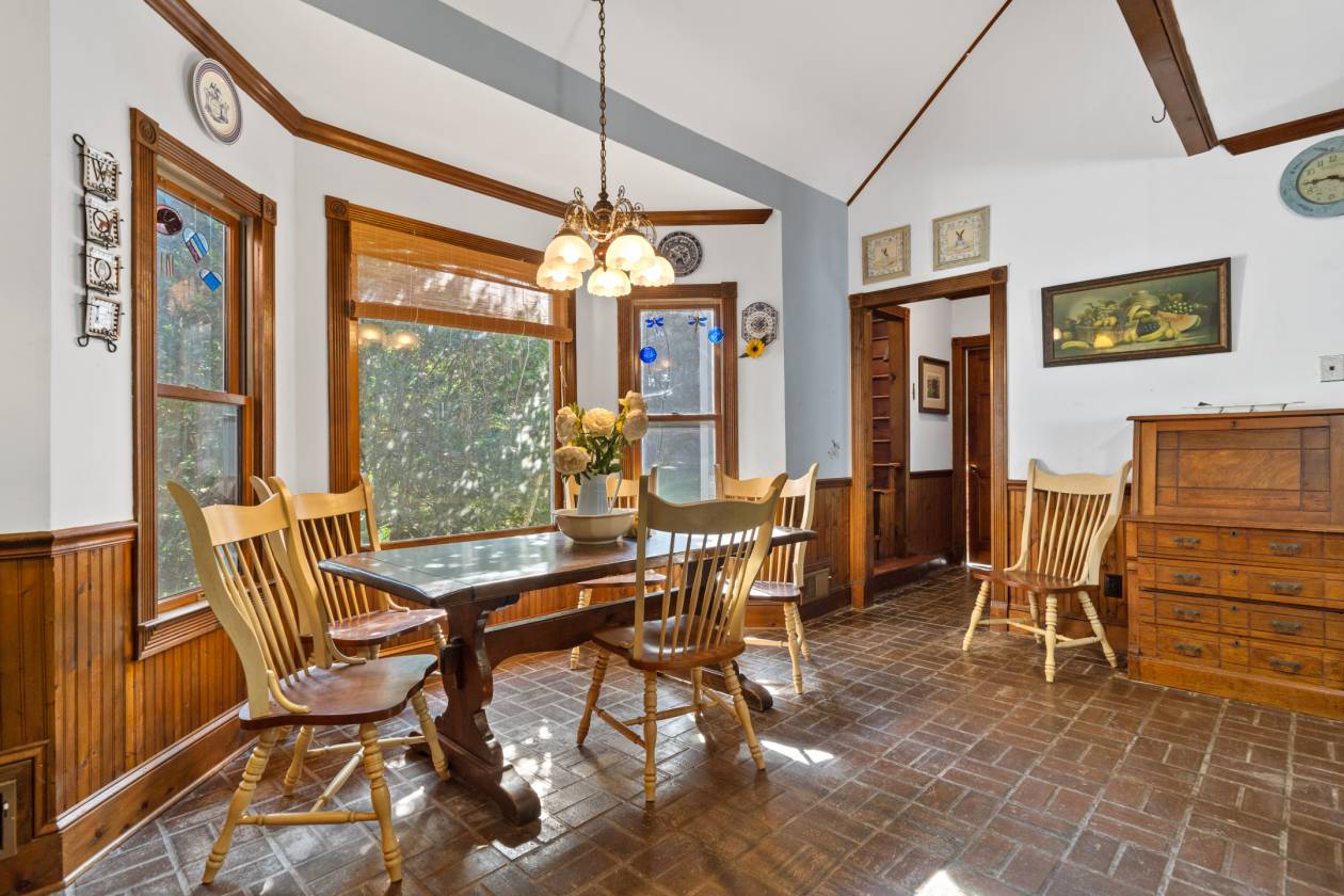 - porches overlooking the property. Garages & Storage: 2-car attached carport + 3-car detached garage/workshop (24x38, added in 2004). Spacious Layout: Two-story foyer, oversized dining room for 12+, large great room with brick fireplace with wood burning insert, and a wood-paneled study/sunroom with floor-to-ceiling windows and access to a back porch. Master on Main: Bright suite with porch access, Master bath with dual vanities, soaking tub, and separate step in shower. Upstairs: Two large secondary bedrooms with walk-in closets, full hall bath, and unique bonus room with charming “hobbit door. ”Terrace Level: Partially finished with dog wash, exterior access, and ample unfinished storage with a partial bathroom. The home boasts charming details—pine hardwood floors, brick flooring in the kitchen and laundry, and half bath on main. Sunroom/office/study with wood cabinetry, built-ins, and plenty