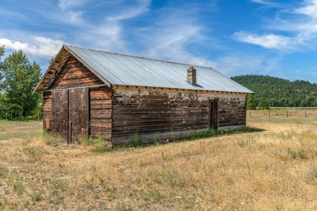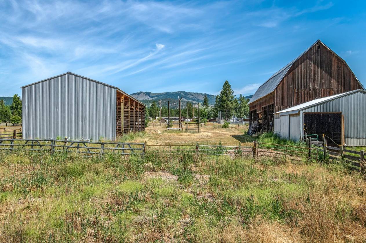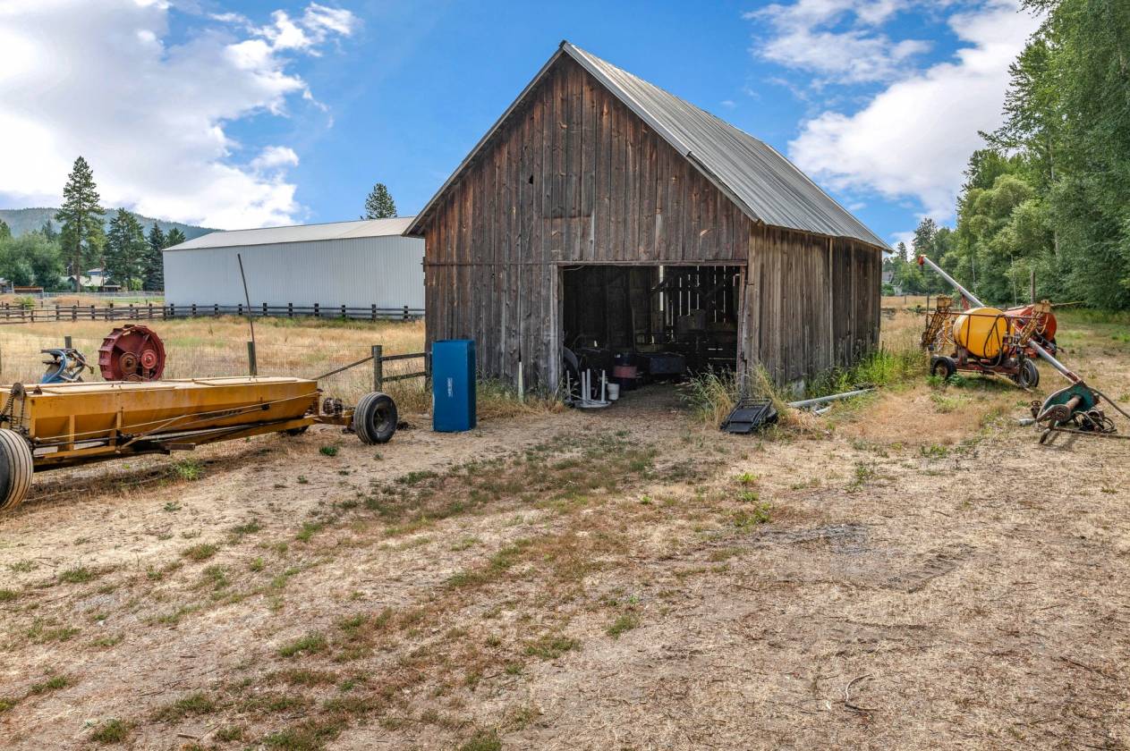 The homestead land is a blend of hayfields, fenced pastures, trees, ponds, and creekside views framed by the Selkirk Mountains, Mt. Spokane, and Hoodoo Mountain. A home with fourteen outbuildings supports every agricultural, equestrian, and recreational need—from hay barns and horse barns to multi-use steel shops, garages, pump houses, and historic farm structures. There is even an old granary building to oats.