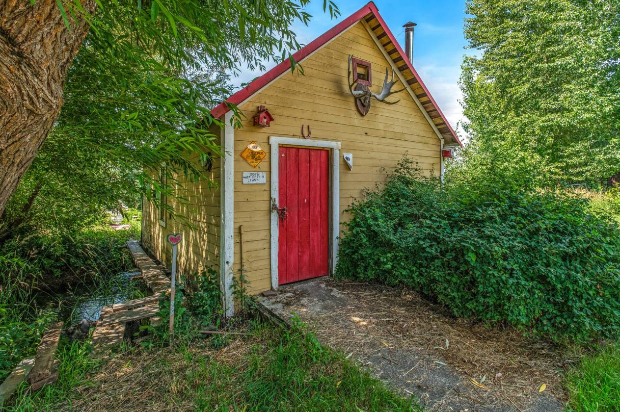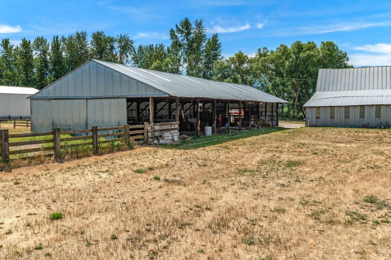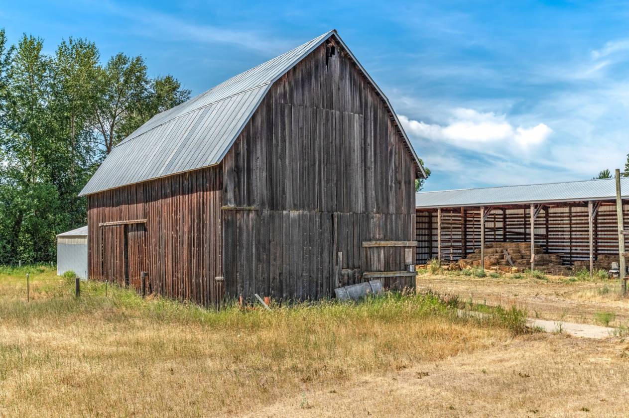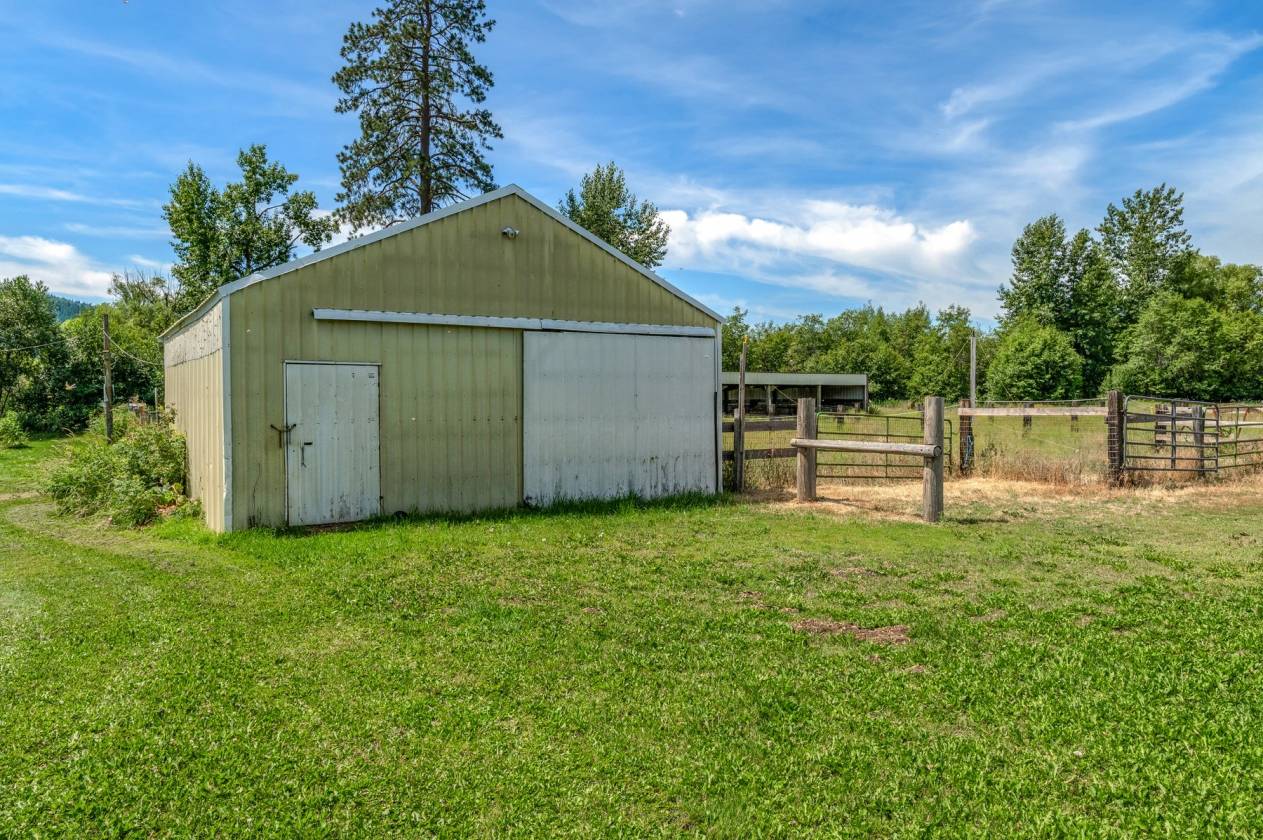 The homestead land is a blend of hayfields, fenced pastures, trees, ponds, and creekside views framed by the Selkirk Mountains, Mt. Spokane, and Hoodoo Mountain. A home with fourteen outbuildings supports every agricultural, equestrian, and recreational need—from hay barns and horse barns to multi-use steel shops, garages, pump houses, and historic farm structures. There is even an old granary building to oats.