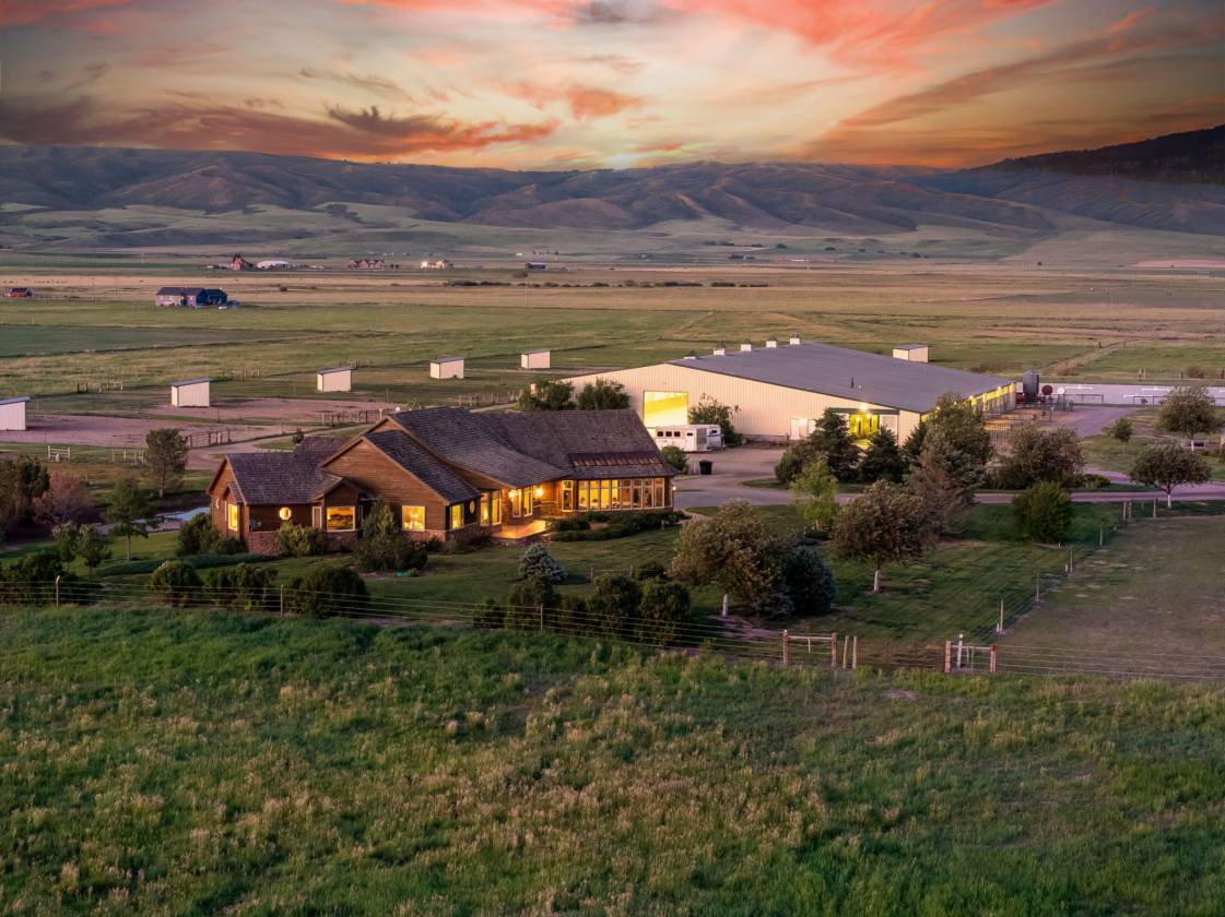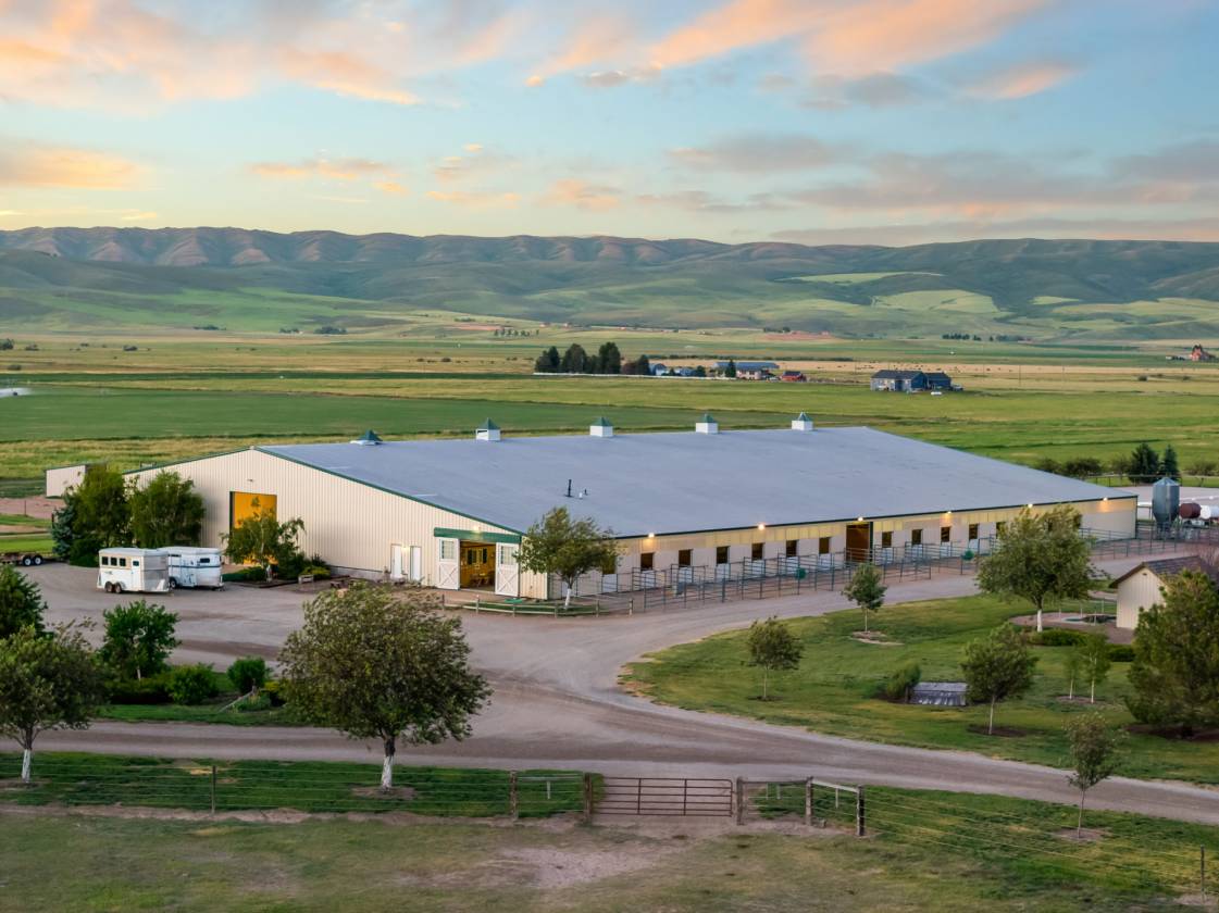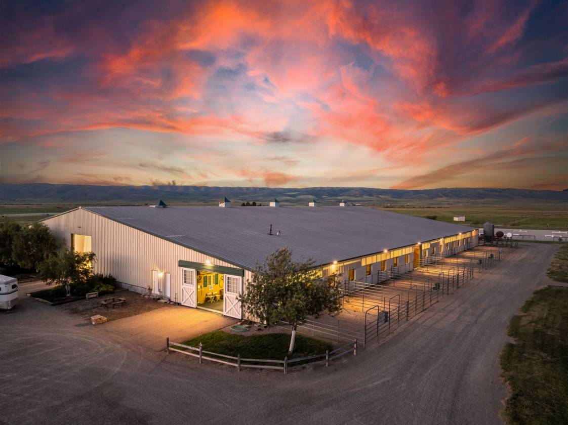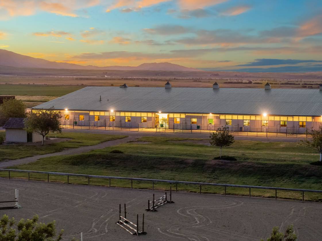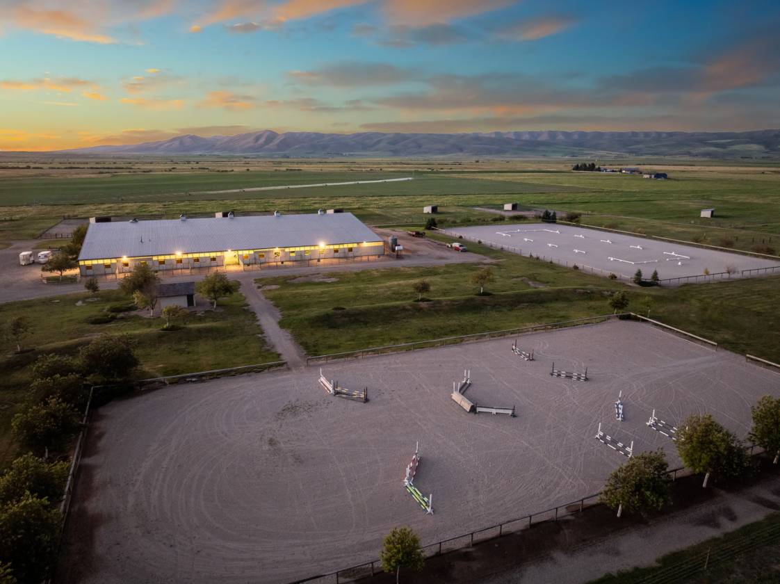 Knox Farm Equine Center, located in the charming small farming and ranching community of Chesterfield, Idaho, is a top-notch commercial equine training facility. Situated in the beautiful Gem Valley of southeastern Idaho, the estate covers a vast expanse of 80± acres, offering abundant room to ride, train, breed horses, or host competitions. The impressive 32,000-square-foot insulated barn and arena features eleven spacious stalls and various amenities such as a vet room and grooming/wash stall. There are also tack rooms, hay and equipment storage, and a one-bedroom apartment/bunkhouse/lounge with a fully equipped kitchen and viewing windows into the arena. The indoor arena is 100 feet X 204 feet with dust-free footing, a raised viewing area, a judge’s platform, and a sound system. Additionally, the property has two outdoor arenas, a shop area, and a one-acre pond. Forty acres are currently in hay production.