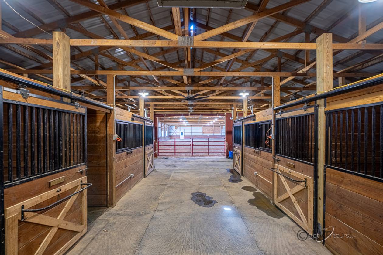 - Attention to detail to the infrastructure is evident throughout this well-manicured and maintained equine paradise. To set the scene, you will be arriving to the main gate of the property, that leads down a long white fenced lane. Off to the right is the outdoor arena area approximately 150' x 100', along with several horse jumping course that begins at the outdoor arena to the paddocks and behind the historic 2-story farm home. Off to the right of the lane is the impressive multi-building structures showcasing a well-groomed 6800 square foot indoor riding arena, (7) stables, of four that have ceiling fans and heaters, equipment storage for all the equipment needed to keep this meticulous equine property in pristine condition. Moving along from the arena area to the original part of the barn, there's the thoughtfully laid out tack room that offers 4 lockers with saddle hangers, full bathroom, laundry, semi-kitchenette with desk, sink, microwave and refrigerator. Oh, but wait-there's more: a trophy room is off the tack room to showcase your trophies, awards, and other special moments that makes your equine journey so special. A workspace area is additional storage of feeding, watering supplies and general supplies that are needed to keep this beauty in tip top shape! A half bathroom is located on the main level of the loft barn. Heading upstairs is an open floor plan that could be used for gathering, special occasions/parties. Currently a portion is used by the seller as a workout home gym. A home office "command station" overlooks the entire compound. There is a horse trail riding area.
