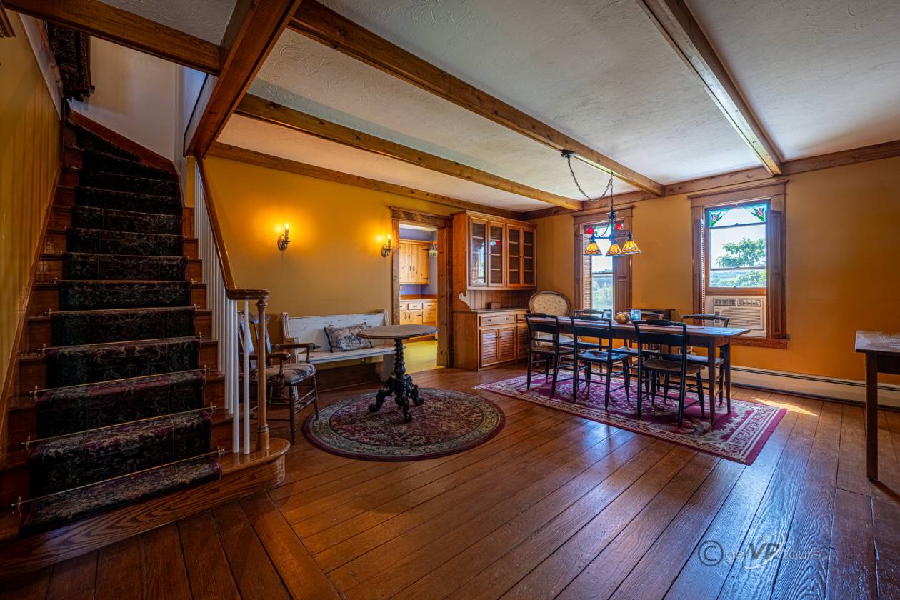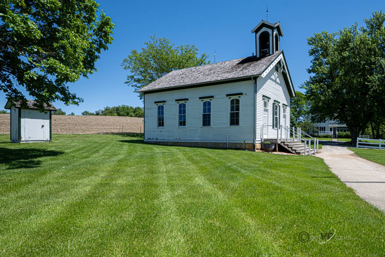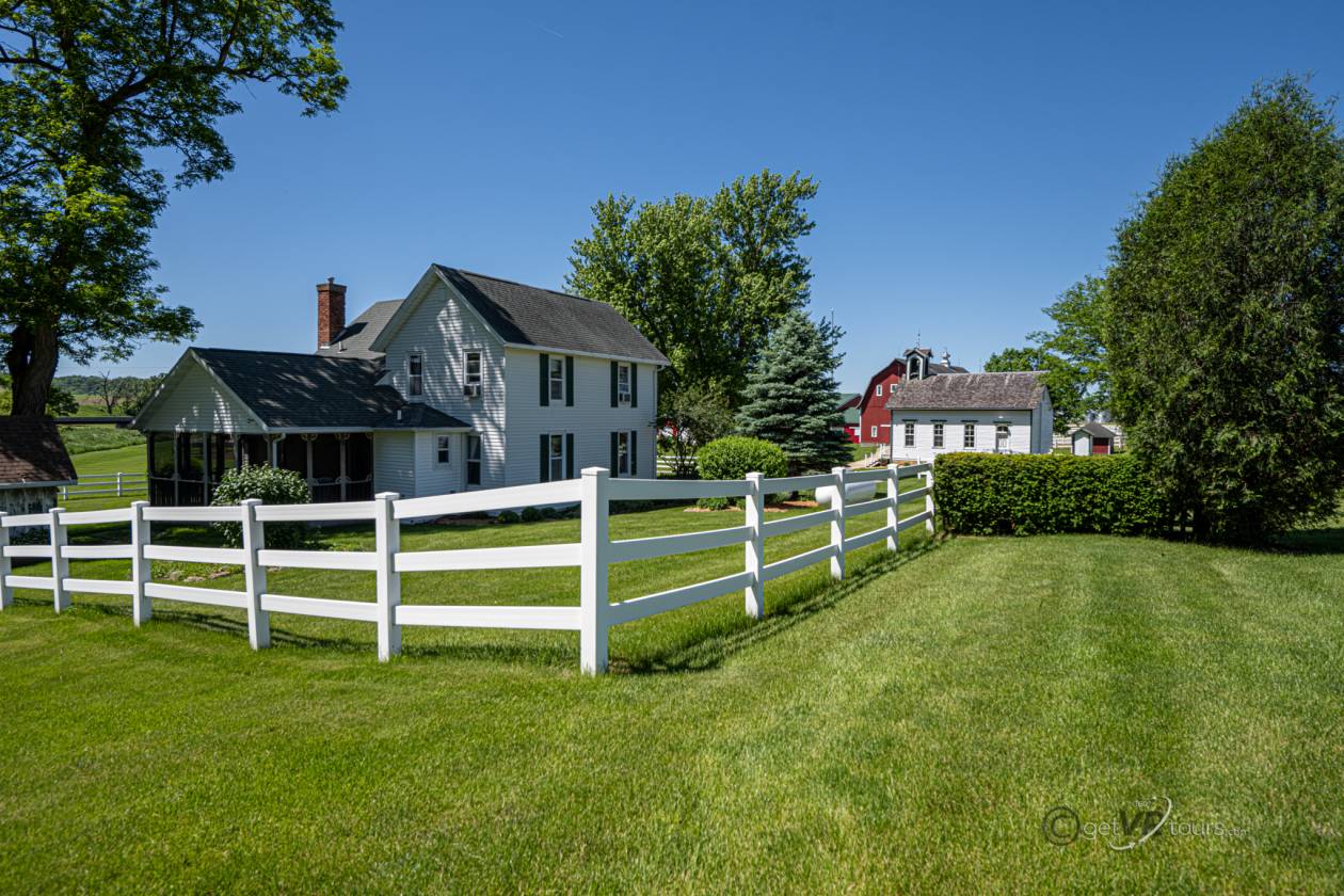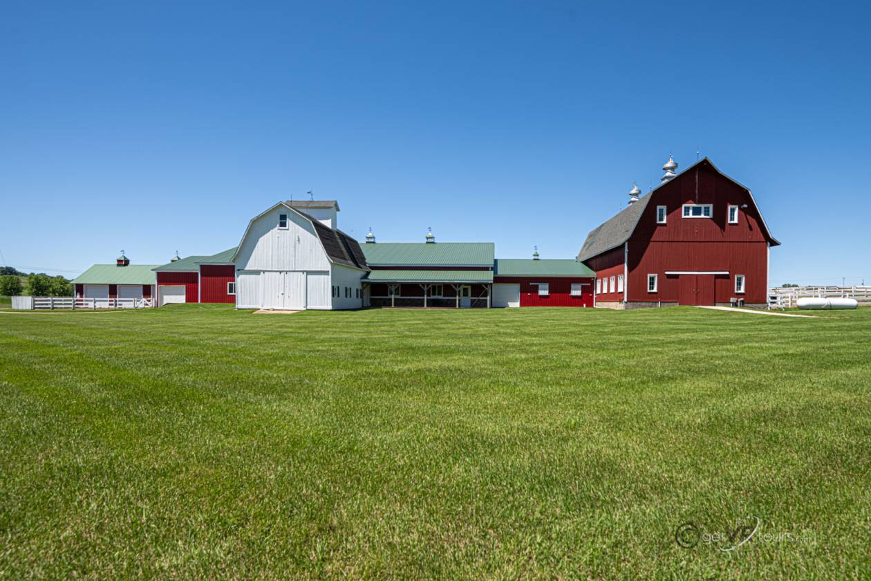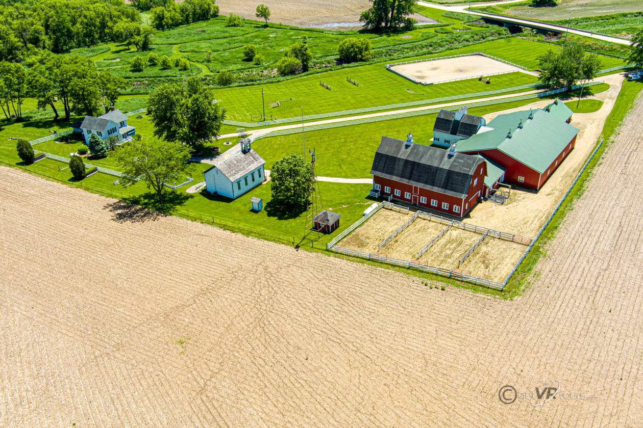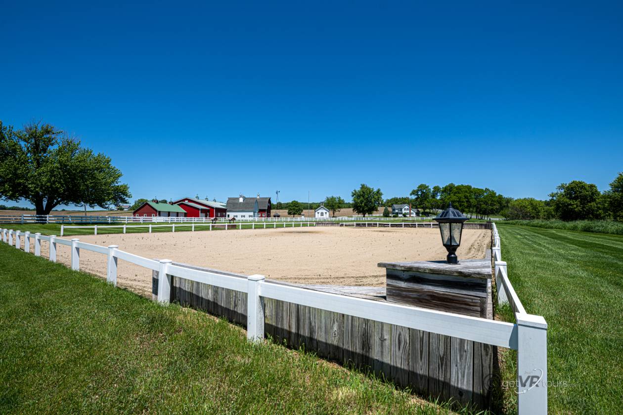 Equestrian property on acreage for Sale, Elizabeth, IL 61028. Come check out this beautifully designed horse property compound located at 8585 S. Derinda Road, Elizabeth, IL 61028. Property sits in the rolling hills of Derinda valley and heart of the Massbach Hounds' Foxhunting Club territory, with the meandering Rush River which flows through. Black Horse Farm is a premiere equestrian property in Jo Daviess County, IL. Attention to detail to the infrastructure is evident throughout this well-manicured and maintained equine paradise. To set the scene, you will be arriving to the main gate of the property, that leads down a long white fenced lane. Off to the right is the outdoor arena area approximately 150' x 100', along with several horse jumping course that begins at the outdoor arena to the paddocks and behind the historic 2-story farm home. Off to the right of the lane is the impressive multi-building structures showcasing a well-groomed 6800 square foot indoor riding arena, (7) stables, of four that have ceiling fans and heaters, equipment storage for all the equipment needed to keep this meticulous equine property in pristine condition. Moving along from the arena area to the original part of the barn, there's the thoughtfully laid out tack room that offers 4 lockers with saddle hangers, full bathroom, laundry, semi-kitchenette with desk, sink, microwave and refrigerator. Oh, but wait-there's more: a trophy room is off the tack room to showcase your trophies, awards, and other special moments that makes your equine journey so special. A workspace area is additional storage of feeding, watering supplies and general supplies that are needed to keep this beauty in tip top shape! A half bathroom is located on the main level of the loft barn. Heading upstairs is an open floor plan that could be used for gathering, special occasions/parties. Currently a portion is used by the seller as a workout home gym. A home office "command station" overlooks the entire compound. What a view to work from home! There is a personal sauna in the office space. The four bedrooms, 2.5 bath 1900's farmhouse has been preserved to keep its country style. Entering the front porch to the interior of the home, there are original hardwood floors are throughout the main level. Walk into the spacious dining room area, off to the left is the living room and master bedroom with private full bath. Kitchen is off the rear of the house, which also offers main level laundry, making this rustic beaut main level living. Upstairs are three more guest bedrooms, with a full bathroom servicing them. A storage room is off the upper bath. Off the kitchen is a screen in porch great for sitting and relaxing and taking in the beauty. This property just keeps on impressing, with the original Derinda Center Town Hall which was also a schoolhouse int he day. School house is set up as a guest suite/quarters that offers a full bathroom, bedroom area and a large open area. VERY UNIQUE to say the least, you really need to see this one in person to truly appreciate what the seller has built. Furnishings and equipment available for purchase. Square footages are approximates and aerial is estimated boundary lines and NOT a survey. Home finished square footage:1956 and schoolhouse guest suite is 936 sq ft. Please see MLS #12091193 or for more information, please provide written inquiry.