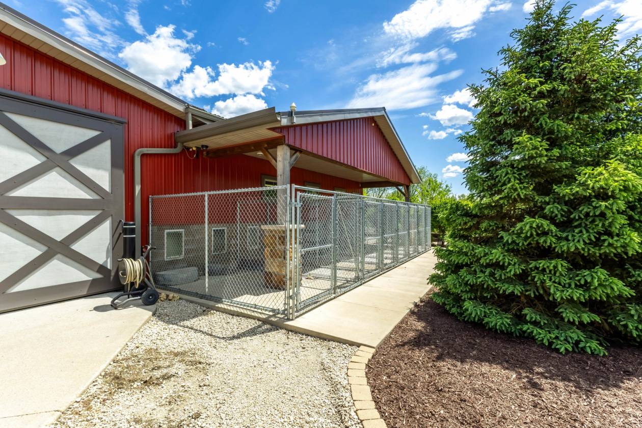 - The attached indoor/outdoor kennel has eight dog runs with radiant floor heat inside and snow melt outside slab, a professional groomer's dog wash tub and a HRV air exchanger.