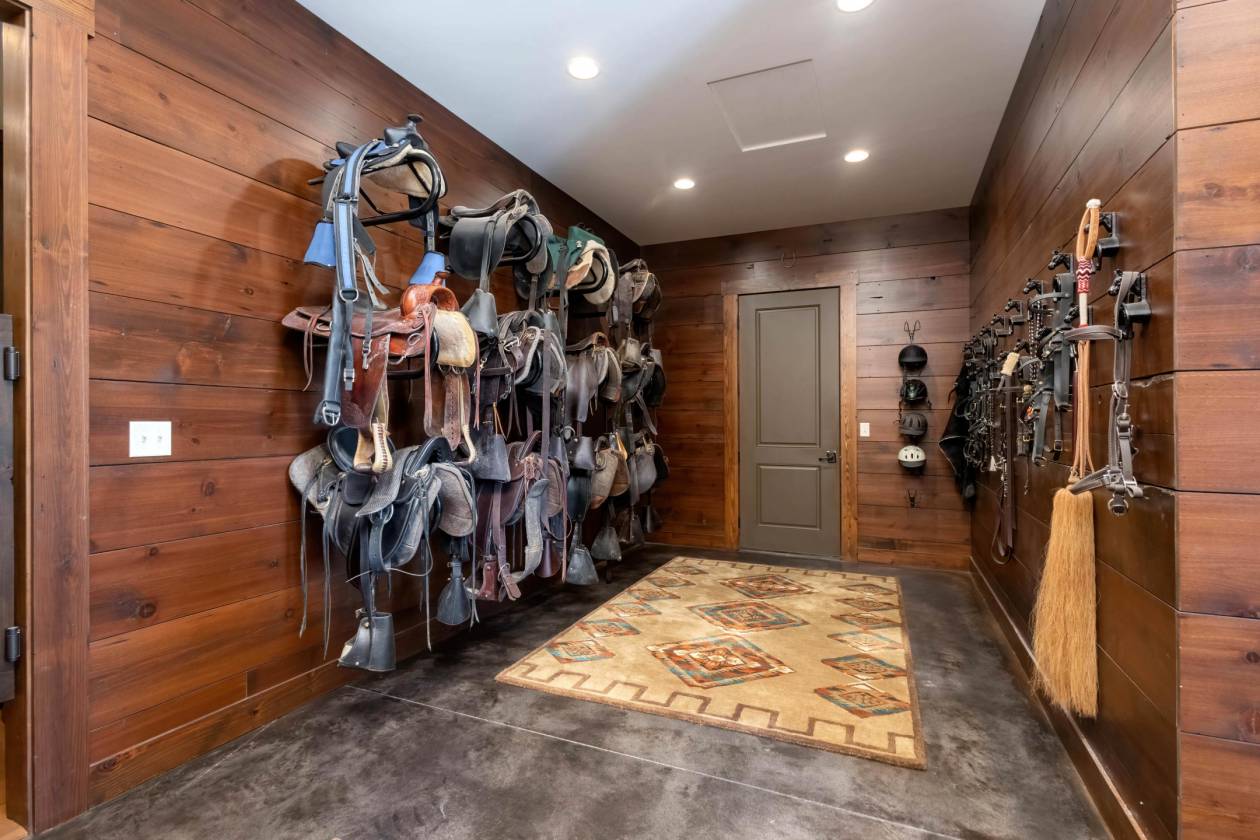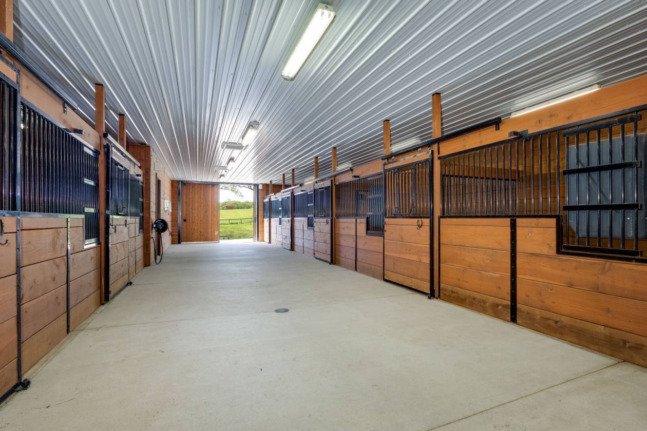 - The attached horse barn features an office with built-in desks and cabinets, powder bathroom, bar area with sink, beverage refrigerator & ice maker, laundry room with full size refrigerator and tack room. There are 12 stalls with radiant floor heat including ten 12'x12' stalls and two 12'x24' foaling stalls, Nelson automatic waterers in each stall, 12'x12' horse wash stall with hot/cold water, four tie stalls and tack-up area, 12' x 12' feed/bedding storage area, and two HRV air exchangers. The barn has a centrally monitored security, fire, CO2, combustible gas, water leak, and temperature system along with a camera system.