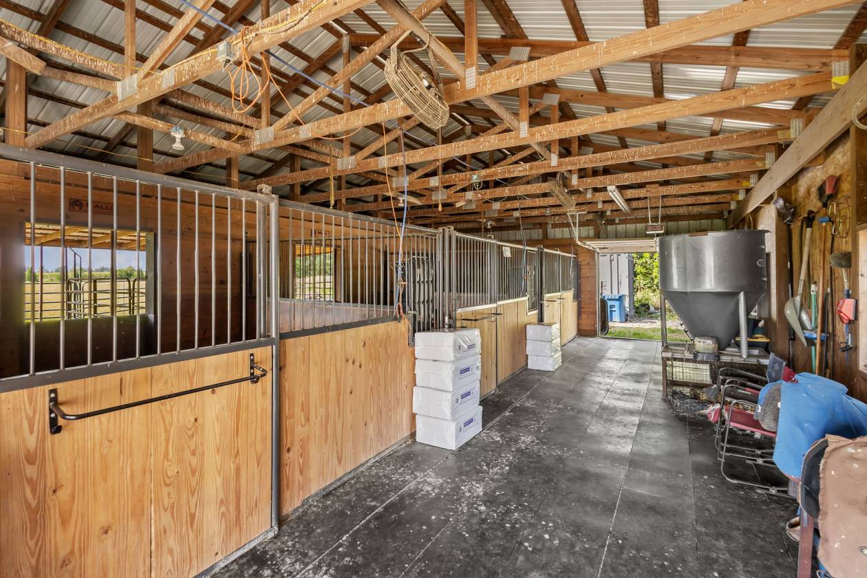- The 24 x 50 horse barn offers 4 stalls with an overhang for outside shelter. An outdoor sand lined riding area, the wash rack, & the fenced in pastures truly make this a turn key horse property.