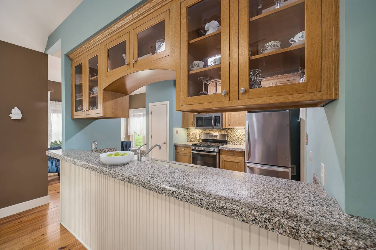 - Custom quarter sawn oak cabinets and granite countertops in kitchen. Breakfast area adjoining kitchen.