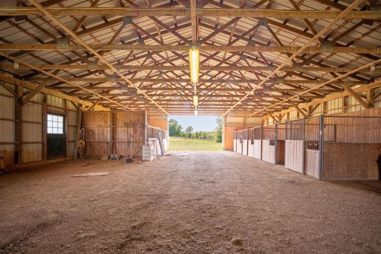 This exceptional 32+ acre farm offers the ideal canvas to bring your equine dreams to life. There is a 5-stall barn complete with a tack room, wash stall, and room to expand with additional stalls or equipment storage. Horse lovers will appreciate the thoughtfully designed layout and convenience. Ride year-round in the massive 200' x 80' indoor arena, prepped and ready for your preferred footing. An additional 22' x 80' storage area provides ample space for hay, tractors, and other essentials. Whether training, boarding, or just enjoying your own horses, this setup is ready to go. Surrounding the buildings are 32+ acres of flat to gently rolling pastures, divided into four fenced sections—ideal for rotational grazing or multiple herds. The foundation is here—customize it to make it your own private equine haven!
