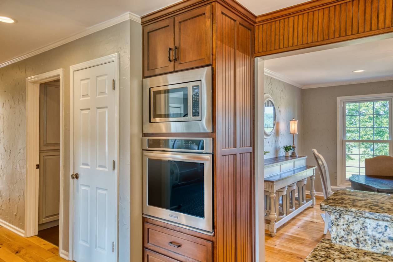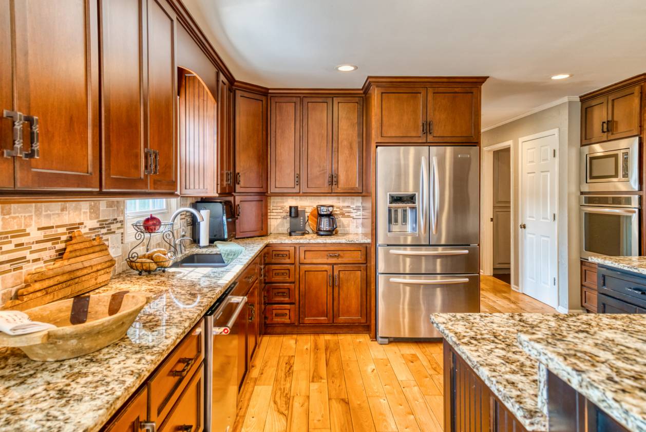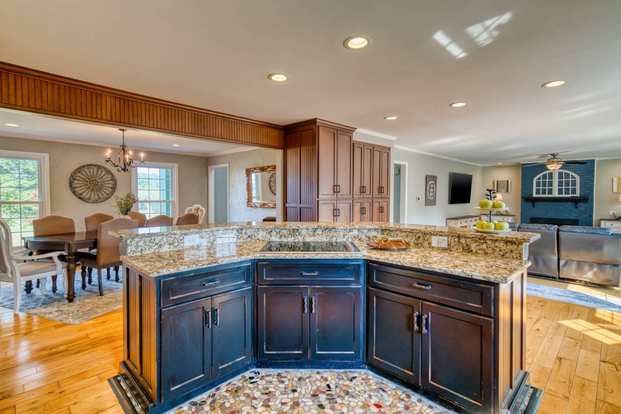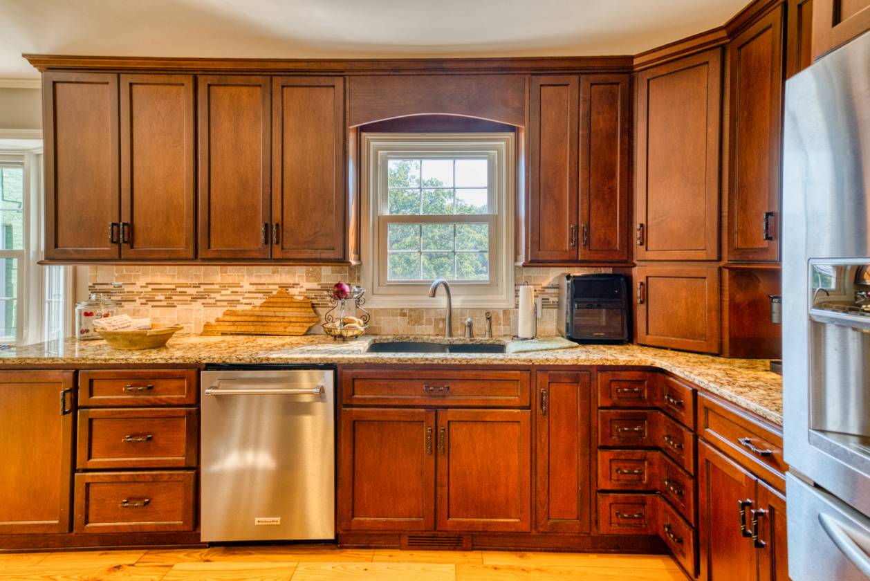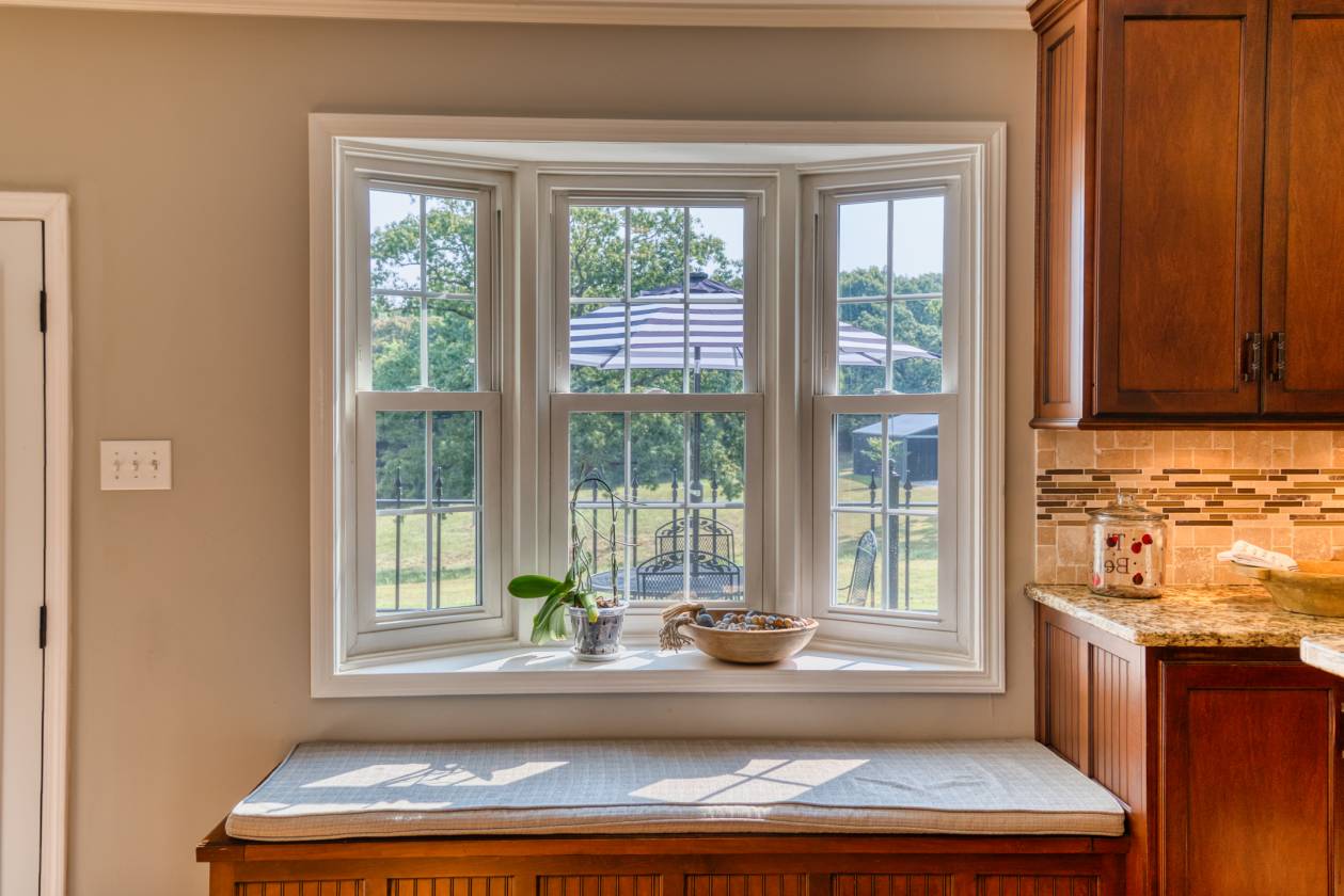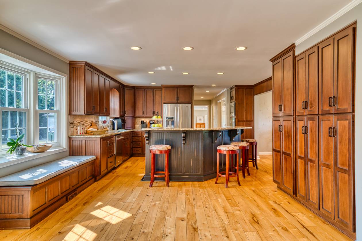 • A spacious kitchen featuring granite countertops, custom cabinetry, and a charming window seat overlooking the back patio.