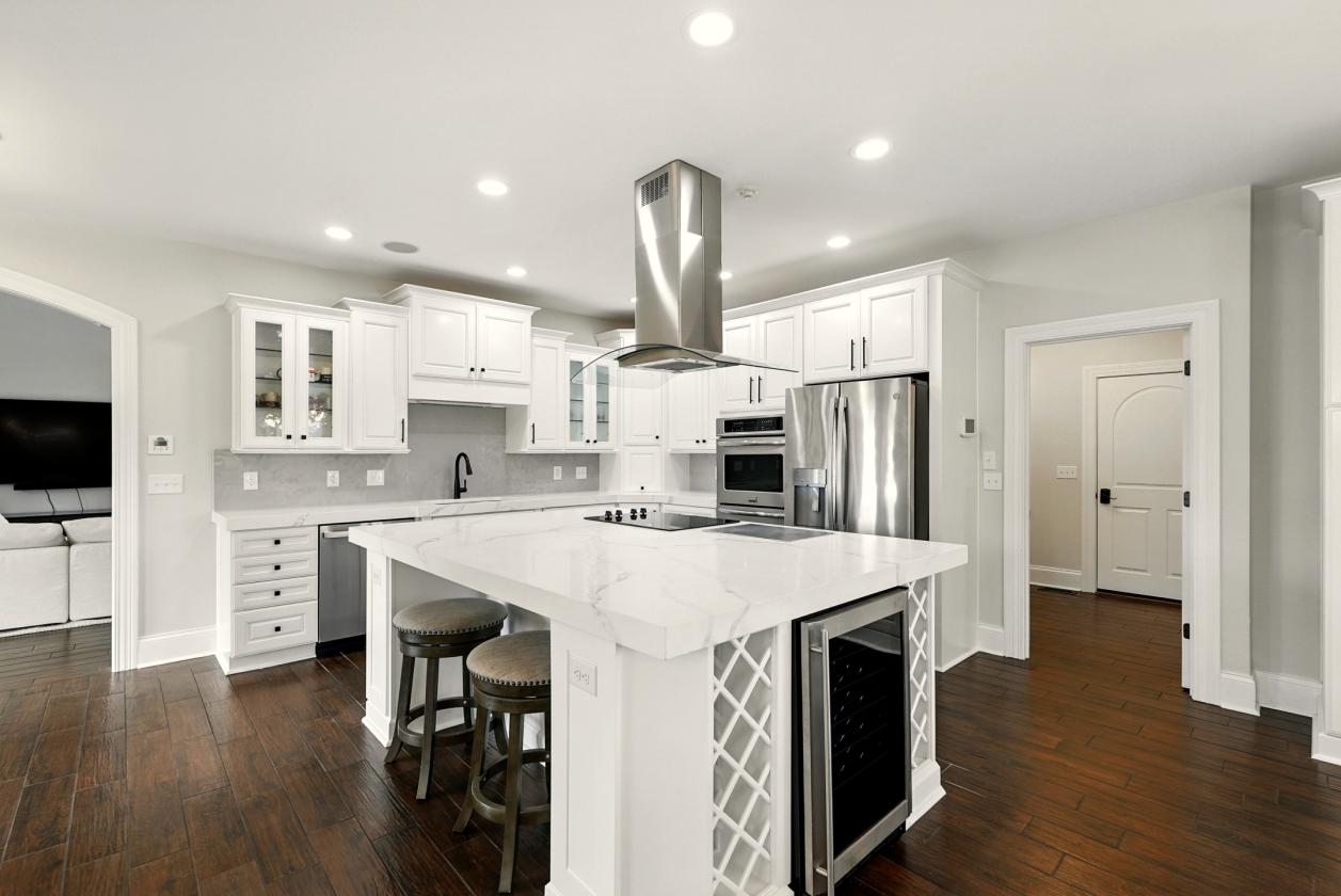 - The first floor features a spacious primary suite with dual custom closets and a luxurious bath. The gourmet kitchen boasts an oversized island with cooktop, double ovens, wine cooler, and separate ice maker, making it perfect for both everyday living and entertaining. With 4 bedrooms, 3.5 baths, and a 3-car garage, there's room for everyone. There is also a bonus room upstairs that could easily be converted into an additional bedroom. The newly updated walk-out basement includes an office (or bedroom), a brand new custom bar, projection screen, and an additional flex space. Every bedroom features a custom closet, blending beauty with practicality.