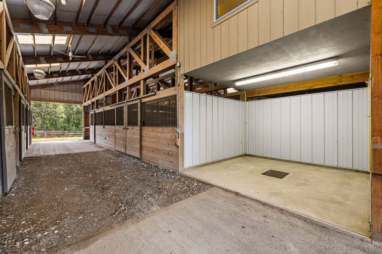- Twenty-one wood stalls with rubber mat flooring, steel bars and water supply