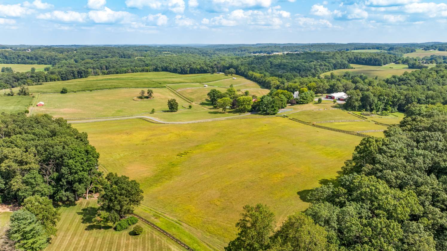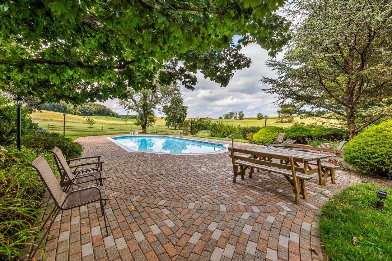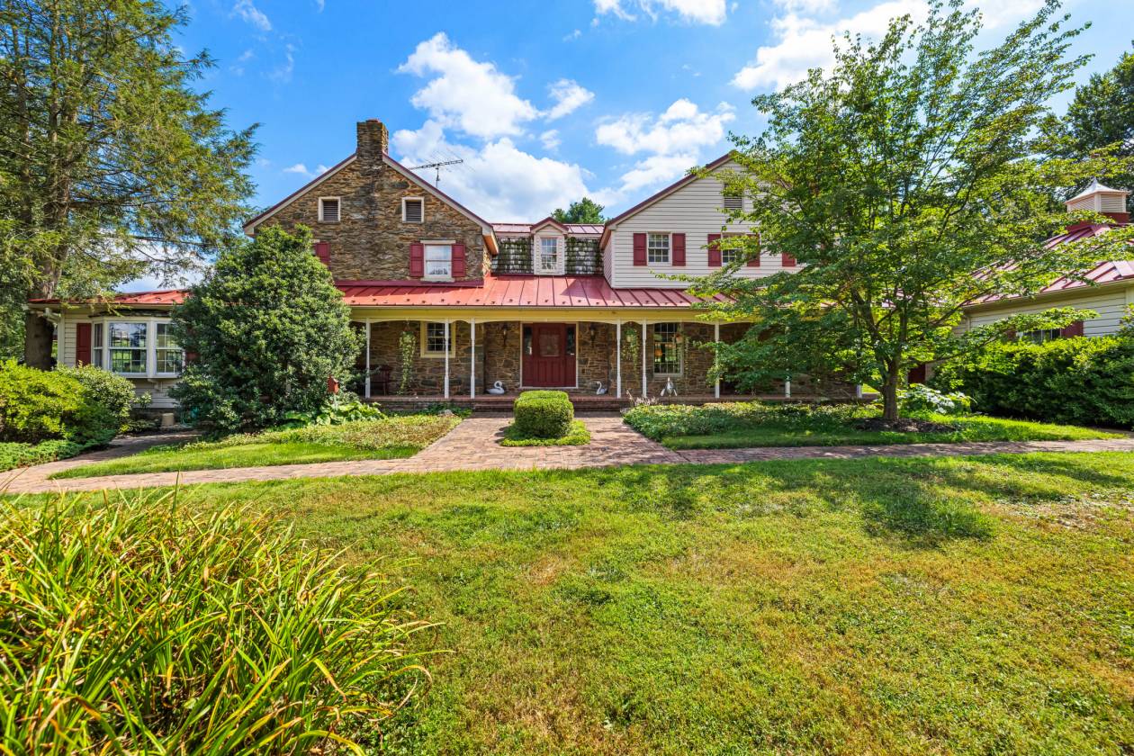 A tree-lined estate drive from Nicodemus Road gives way to bright sunlight and beautifully maintained pastures and fenced paddocks leading to the core of the 90-acre historic Rich Meadow Farm. This amazing equestrian facility is anchored by an 18th century stone farmhouse seamlessly expanded through the years and beautifully updated, set amidst lush gardens and professional landscaping. A 2-story Foyer with rustic stone and wood paneled walls sets the tone for this remarkable 5 Bedroom, 4 Bath home. An expansive Family Room with beamed ceiling, wood burning fireplace and wet bar, cherry Kitchen opening to formal Dining Room radiate from the Foyer. A bright and sunny 35-foot Breakfast/Morning Room has access to the 2-level Deck and the vaulted Sun Room with flagstone floor. Original to the 18th century farmhouse are the Living Room and Office- both with fireplaces- and the back Foyer, the original entrance hall, all with deep-set windows and wide-plank vintage flooring. An expansive Primary Suite, 4 additional Bedrooms and 2 Baths share the upper level. Enjoy alfresco dining on quiet evenings on the Deck overlooking the pond or a refreshing dip in the heated in-ground pool. There is a separate Office or Guest House with a screened porch and deck overlooking the pond. There are 2 large barn complexes that include a total of 35 horse stalls, bank barn with 2 silos, tremendous tractor/machine shed with workshop, tack rooms, wash stall and 2 modern 2-bedroom apartments. The farm boasts 13 fenced watered paddocks, fenced riding ring, run-in sheds and a chicken coop. All beautifully maintained, eagerly awaiting new stewardship.