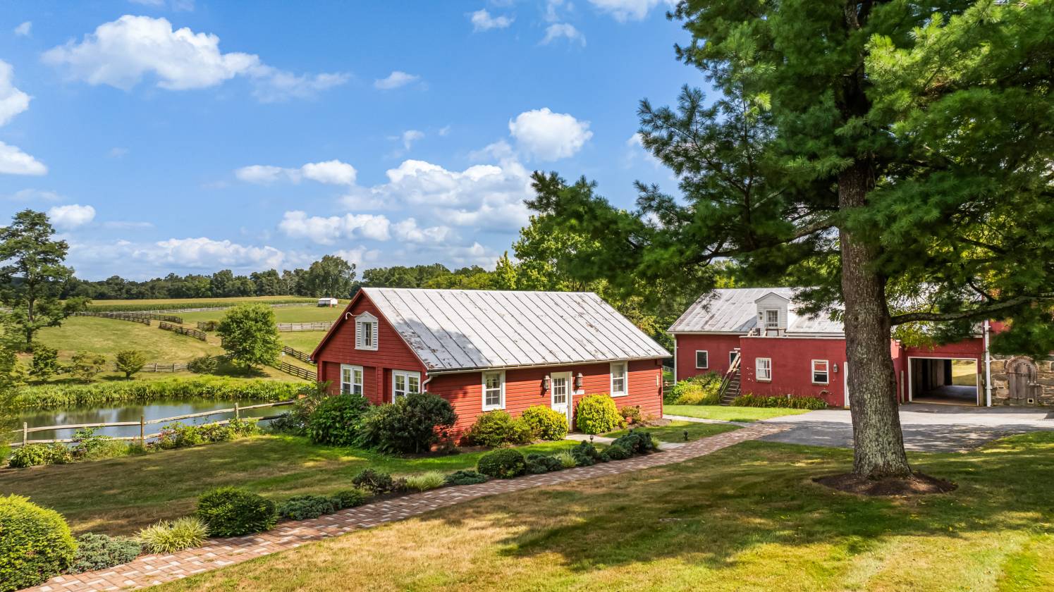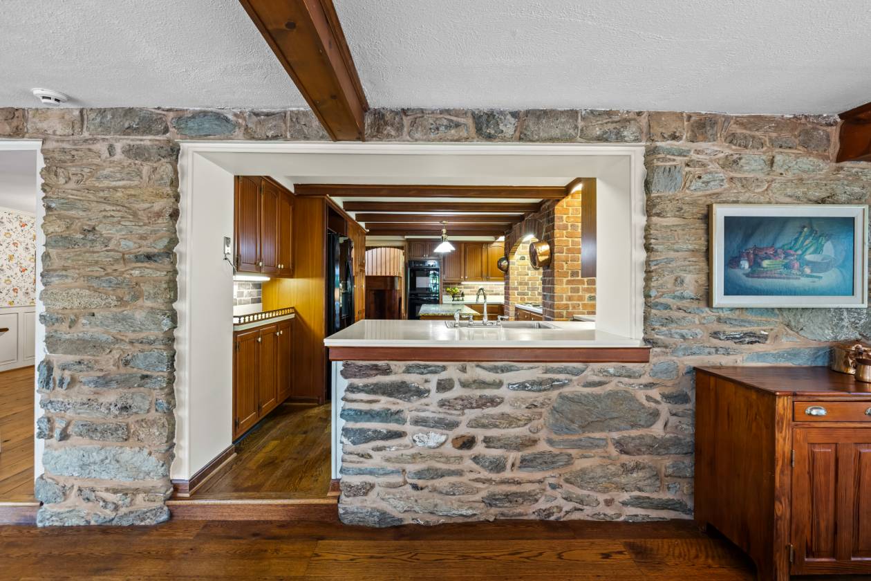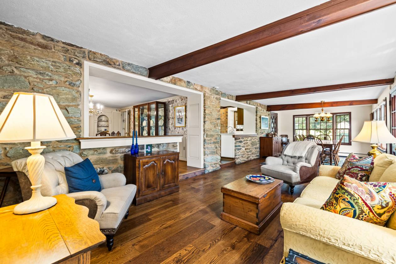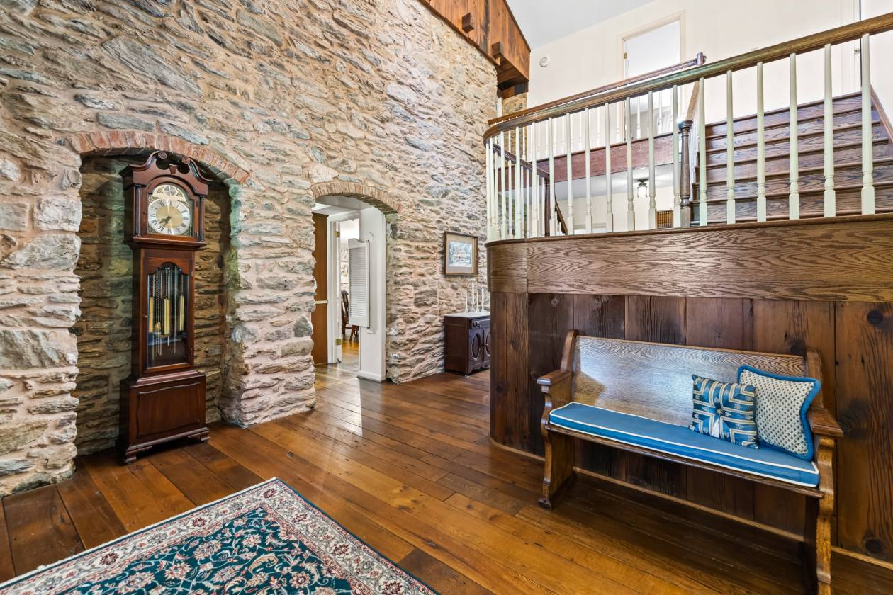 A tree-lined estate drive from Nicodemus Road gives way to bright sunlight and beautifully maintained pastures and fenced paddocks leading to the core of the 90-acre historic Rich Meadow Farm. This amazing equestrian facility is anchored by an 18th century stone farmhouse seamlessly expanded through the years and beautifully updated, set amidst lush gardens and professional landscaping. A 2-story Foyer with rustic stone and wood paneled walls sets the tone for this remarkable 5 Bedroom, 4 Bath home. An expansive Family Room with beamed ceiling, wood burning fireplace and wet bar, cherry Kitchen opening to formal Dining Room radiate from the Foyer. A bright and sunny 35-foot Breakfast/Morning Room has access to the 2-level Deck and the vaulted Sun Room with flagstone floor. Original to the 18th century farmhouse are the Living Room and Office- both with fireplaces- and the back Foyer, the original entrance hall, all with deep-set windows and wide-plank vintage flooring. An expansive Primary Suite, 4 additional Bedrooms and 2 Baths share the upper level. Enjoy alfresco dining on quiet evenings on the Deck overlooking the pond or a refreshing dip in the heated in-ground pool. There is a separate Office or Guest House with a screened porch and deck overlooking the pond. There are 2 large barn complexes that include a total of 35 horse stalls, bank barn with 2 silos, tremendous tractor/machine shed with workshop, tack rooms, wash stall and 2 modern 2-bedroom apartments. The farm boasts 13 fenced watered paddocks, fenced riding ring, run-in sheds and a chicken coop. All beautifully maintained, eagerly awaiting new stewardship.