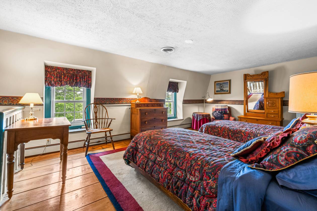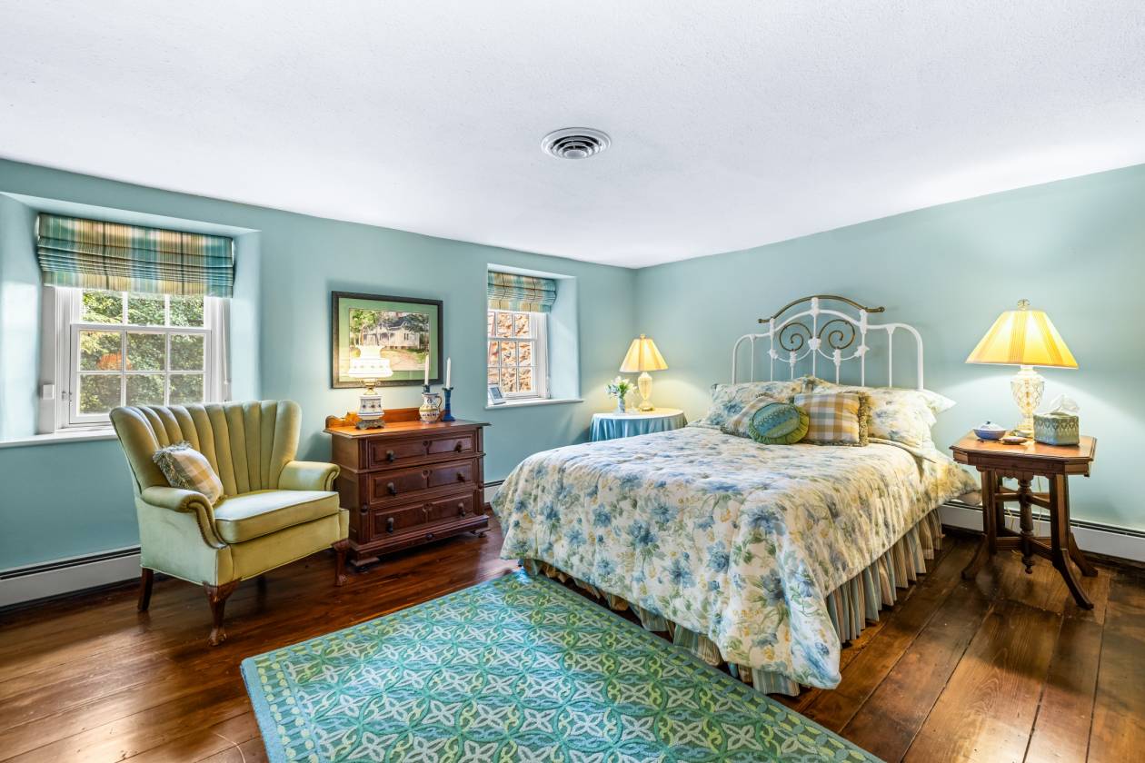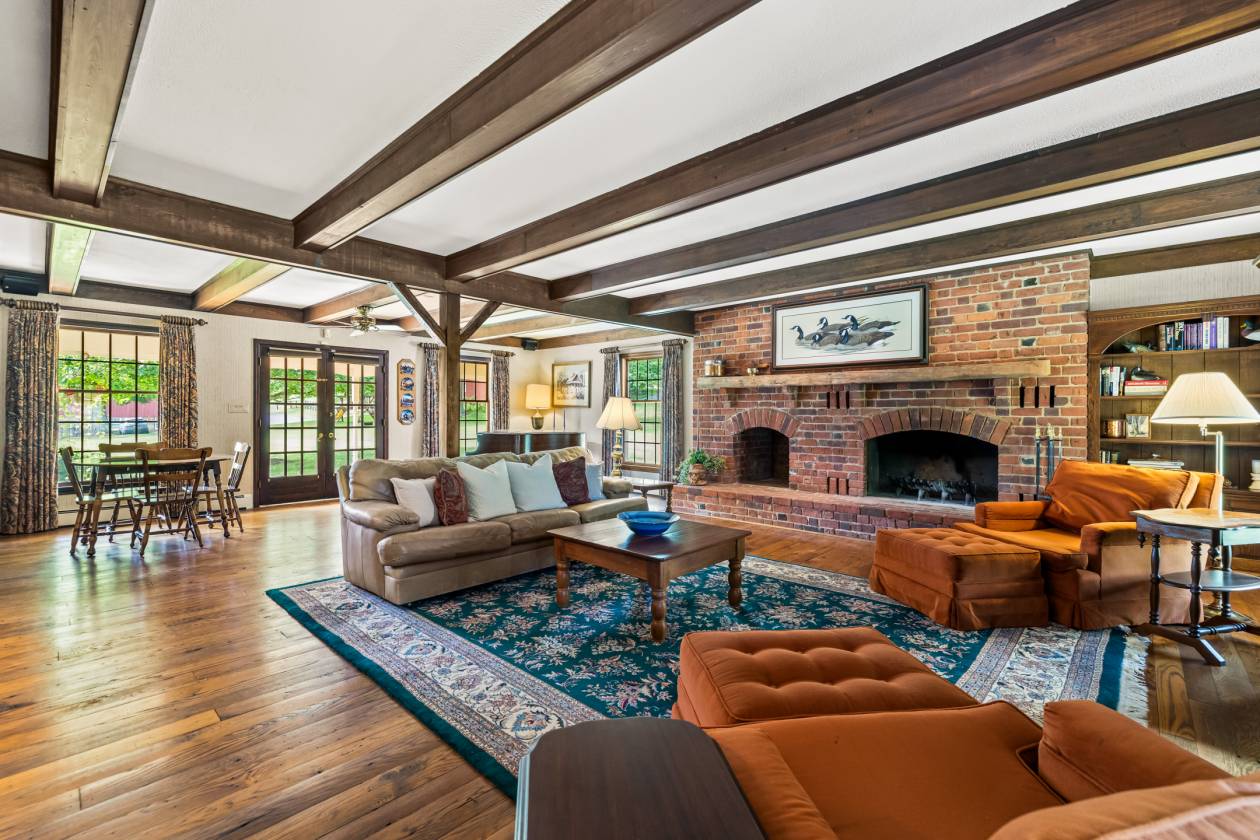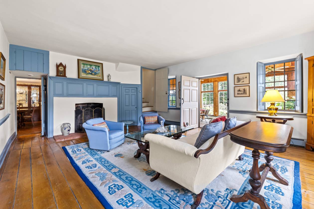 - Living Room served as the parlor in the original farmhouse, vintage wide-plank flooring, wood burning fireplace with gas insert, four deep-set windows