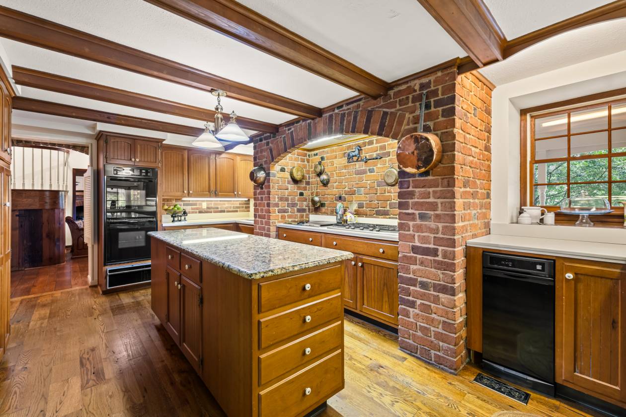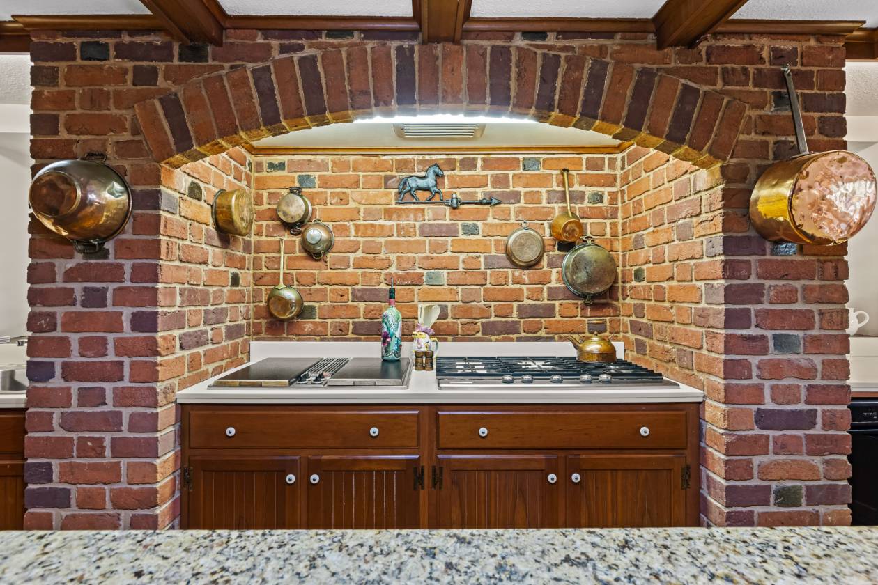 - Cherry kitchen with brick arched alcove, Jenn-Air cooktop, KitchenAid 5 burner gas cooktop, double wall oven, open flow to Breakfast/Morning Room