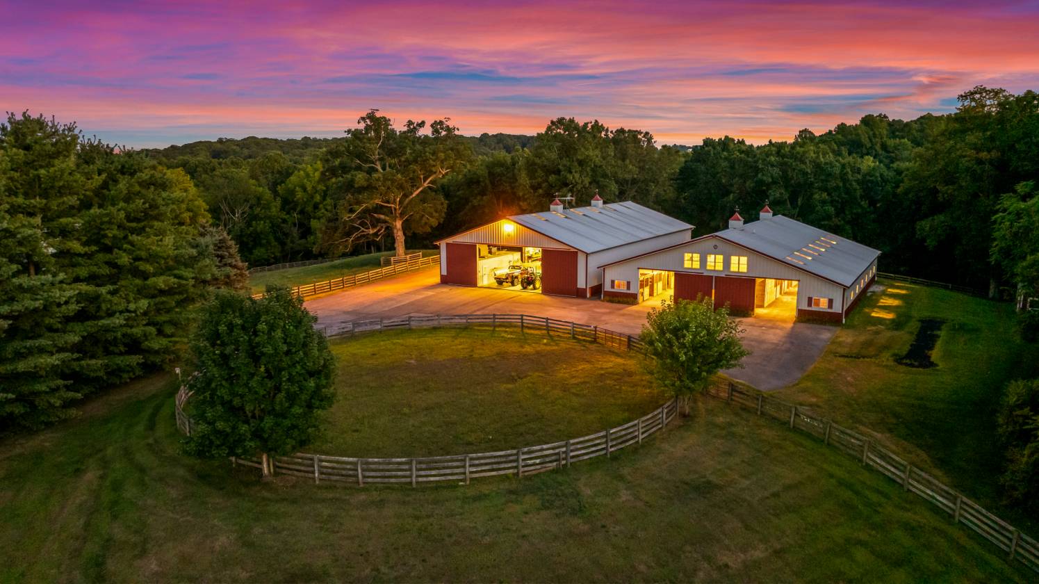 - Three sets of oversize sliding barn doors- back doors to attached watered run-in shed