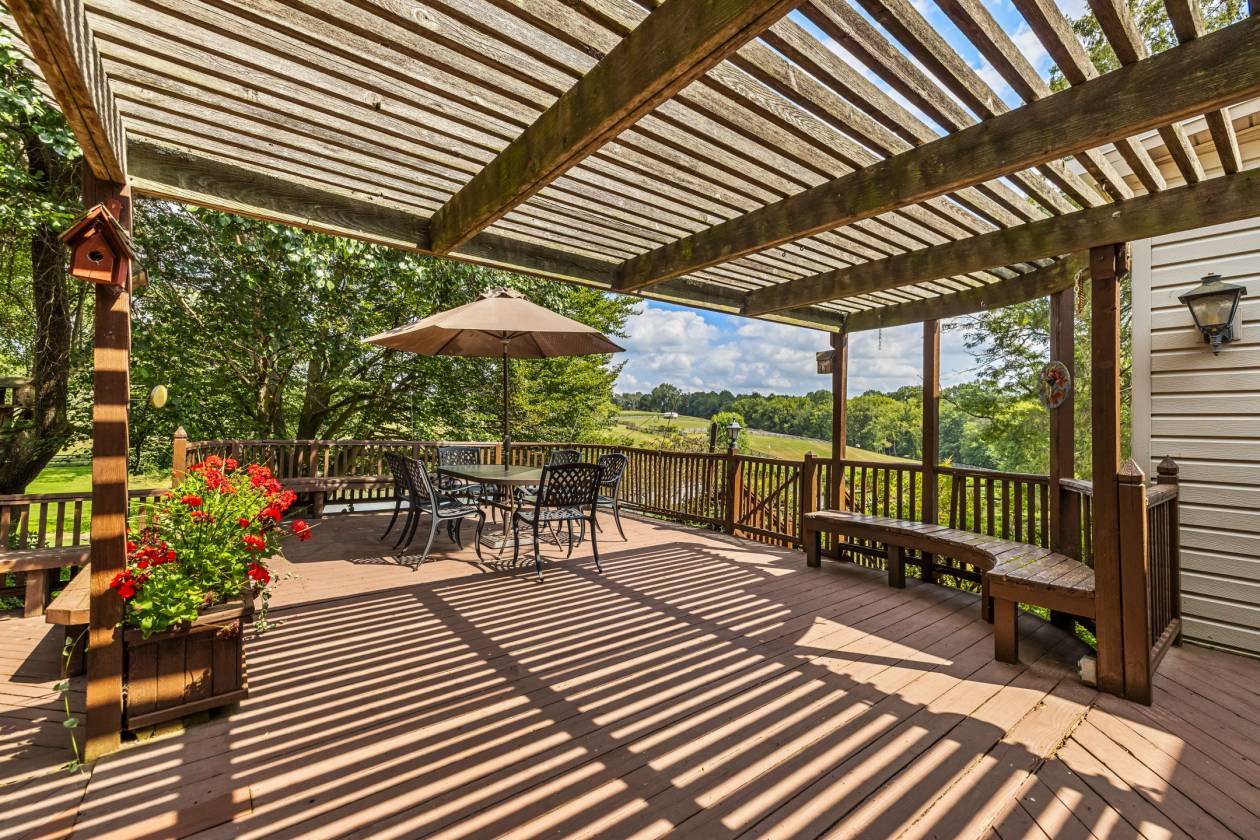 - Two-level deck (38’ X 36’) with wood railings, pergola, built-in bench seating, lantern lighting on railing posts and access from Sunroom and Breakfast/Morning Room