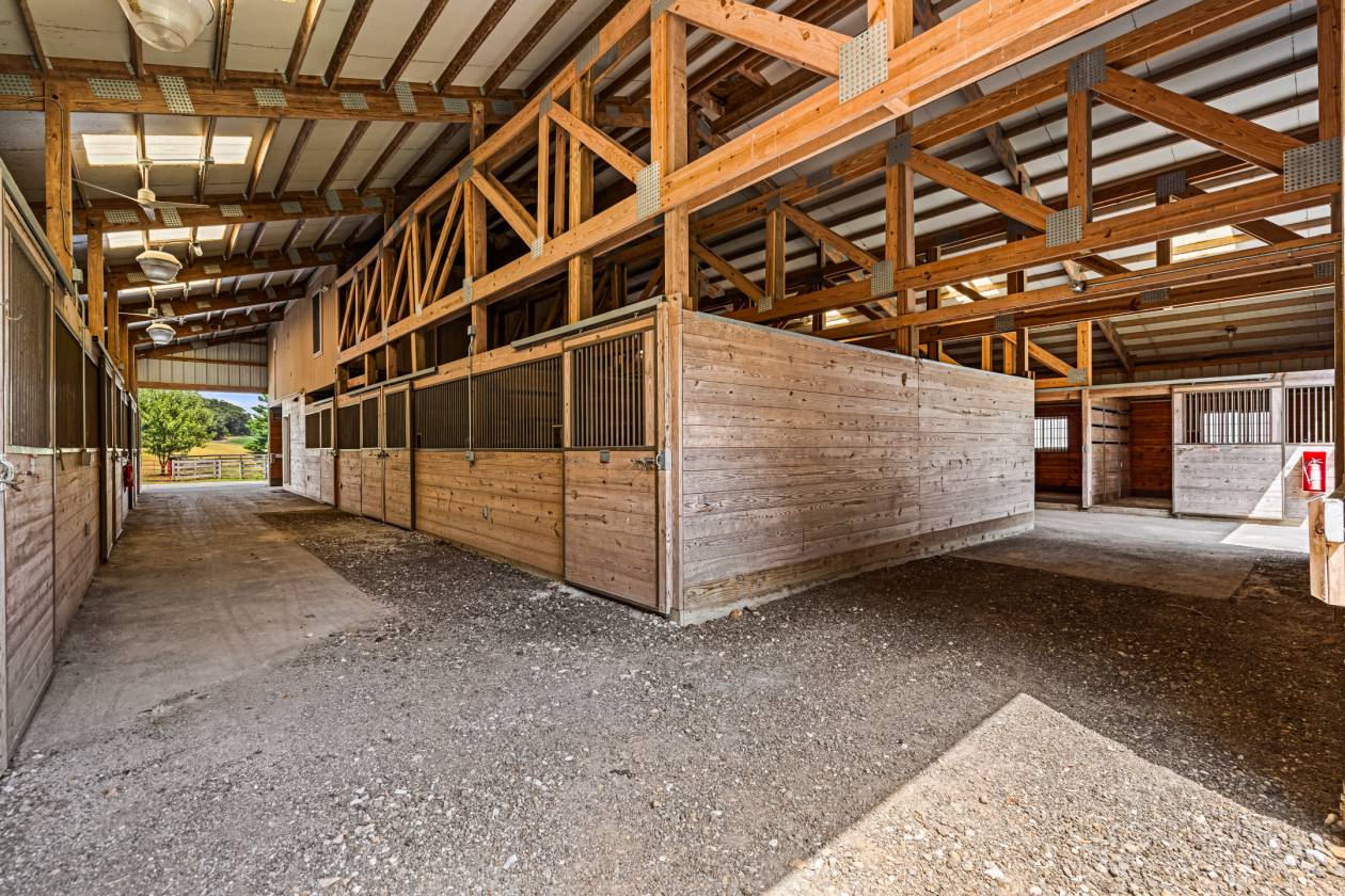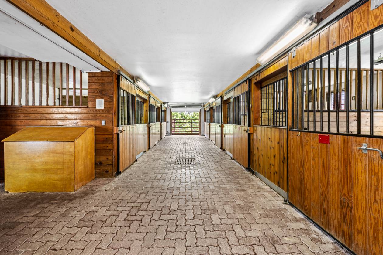 - Lower Level with paver brick aisles, 14 cedar stalls with rubber mat flooring, steel bars and water supply, 4 overhead doors, stone foundation walls and attached run-in shed