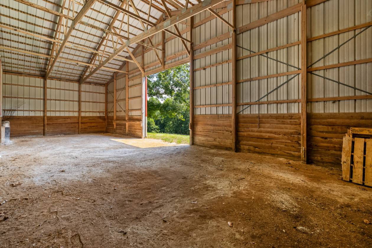 - Upper Level with post and beam construction, 2+ story vaulted ceiling, lofted hay barn, full-width sliding barn doors, heavy duty wood plank flooring, louvered windows, industrial exhaust fan, ceiling lights and access to Apartment