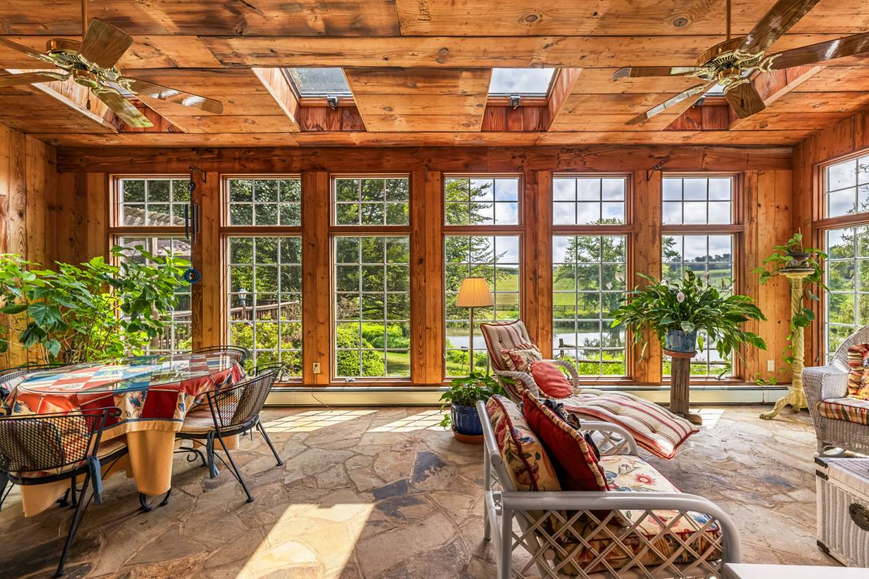 - Vaulted Sun Room with stone interior walls (original exterior walls and vintage door), sliding glass doors to deck